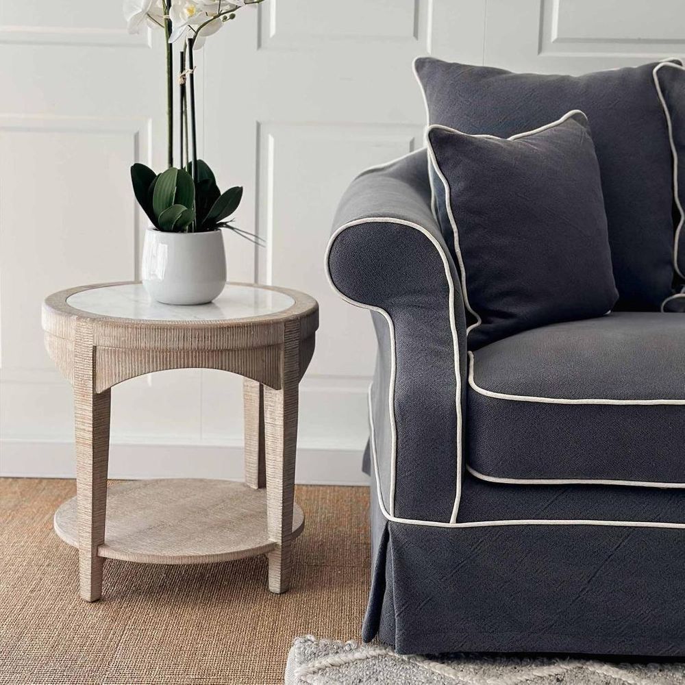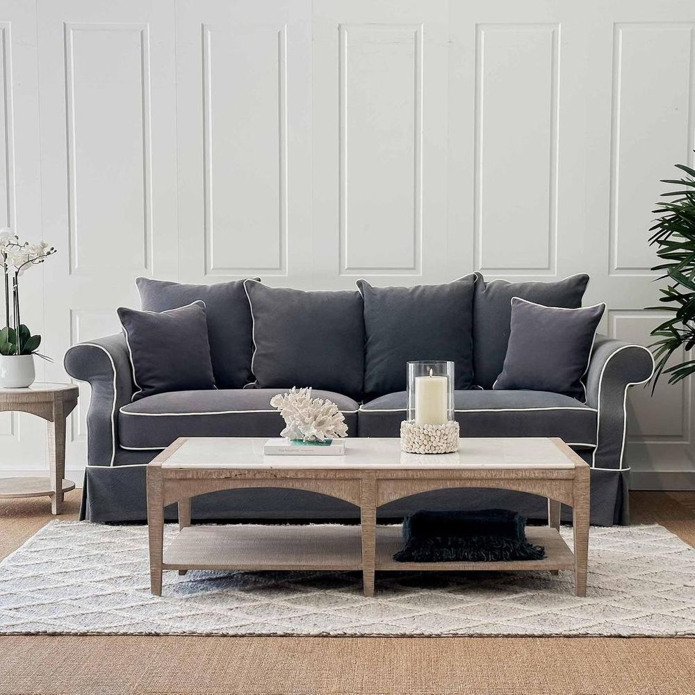 Dimensions: W226cm D96cm H81cm Seat Dimensions: W200cm D70cm H45cm Arm Dimensions: W15cm H70cm Weight: 75kg Colour: Navy Materials: Timber/Foam/Fabric Frame Materials: Timber Frame Material Details: Pine wood Leg Materials: Timber Leg Material Details: Rubber wood Upholstered: Yes Upholstery Materials: Fabric Fabric Type: 75% linen, 25% cotton Seat Padding Materials: High density foam Back Padding Materials: PP Cotton Seating Firmness: Medium Back Type: Scatter Back Seating Capacity: 3 Timber Construction: Solid wood Seat Suspension Type: Webbings and springs Seat Suspension Details: Polypropylene webbing Seat Cushion Removable: Yes Back Cushion Removable: Yes Cushion Cover Removable: Yes Machine Washable Cushion Cover: No, dry clean only Recommended Weight Capacity: 300kg Foot Pads Included: Yes Foot Pads Type: Rubber pads Outdoor Use: No Clearance from the floor: 15cm Assembly: Yes, screw the legs into the sofa base