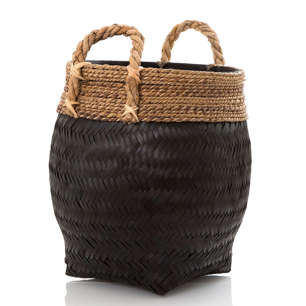 Mauritius black basket is a best seller because of its stark black and natural colourings. It is a large round shaped basket that is tightly woven and very sturdy. It has 2 thick rope handles on either side for easy moving. Mauritius basket looks fabulous styled alone on the floor but can equally be useful to store clothes, or toys, or firewood. It can also be used as a laundry basket. It also looks amazing with an artificial tree planted inside or makes a statement with artificial ferns planted inside and hanging out. INDOOR USE ONLY.