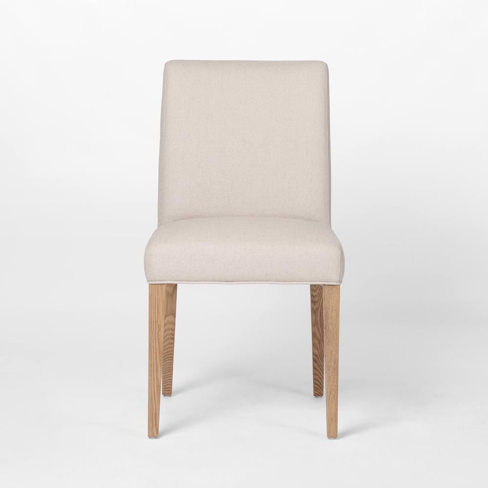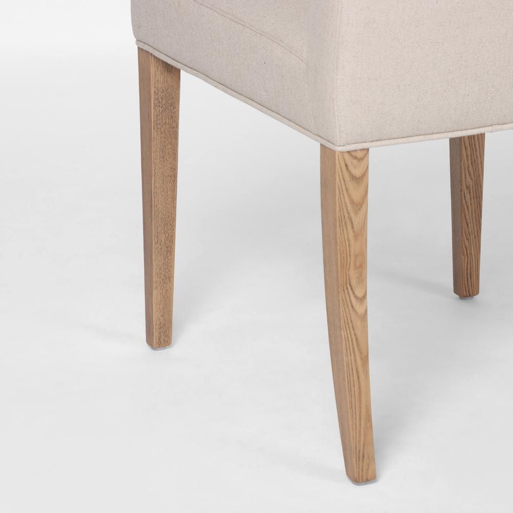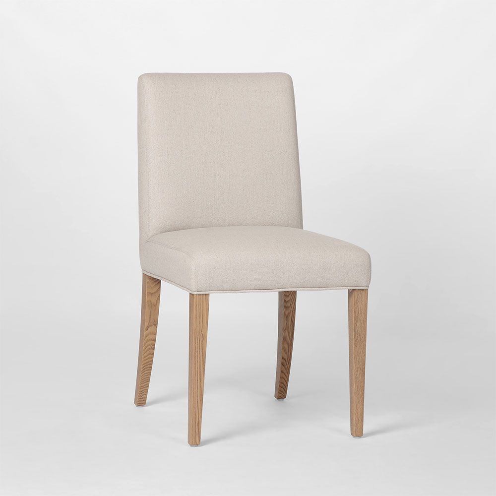 FRAME Comfortable padded seat & backrest MATERIAL Soft polyester linen fabric & foam seating with a solid ashwood wood leg frame ASSEMBLY Fully assembled, 2pcs per carton CARE Vacuum & spot clean regulary