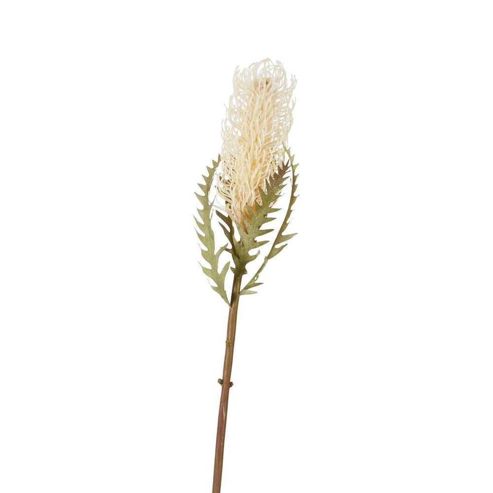 Inspired by Australian native florals, this outstandingly realistic artificial stem features a stunning, intricately detailed white banksia head with distinctly shaped leaves. The large and textured head comes in a neutral cream shade which is perfect for mixing with other native flowers and greenery from our range. - Dried floral look - Amazing textures and layers for added visual interest - 75cm long - Cream coloured with green leaves Materials: Made of fabric, plastic paper and wire.