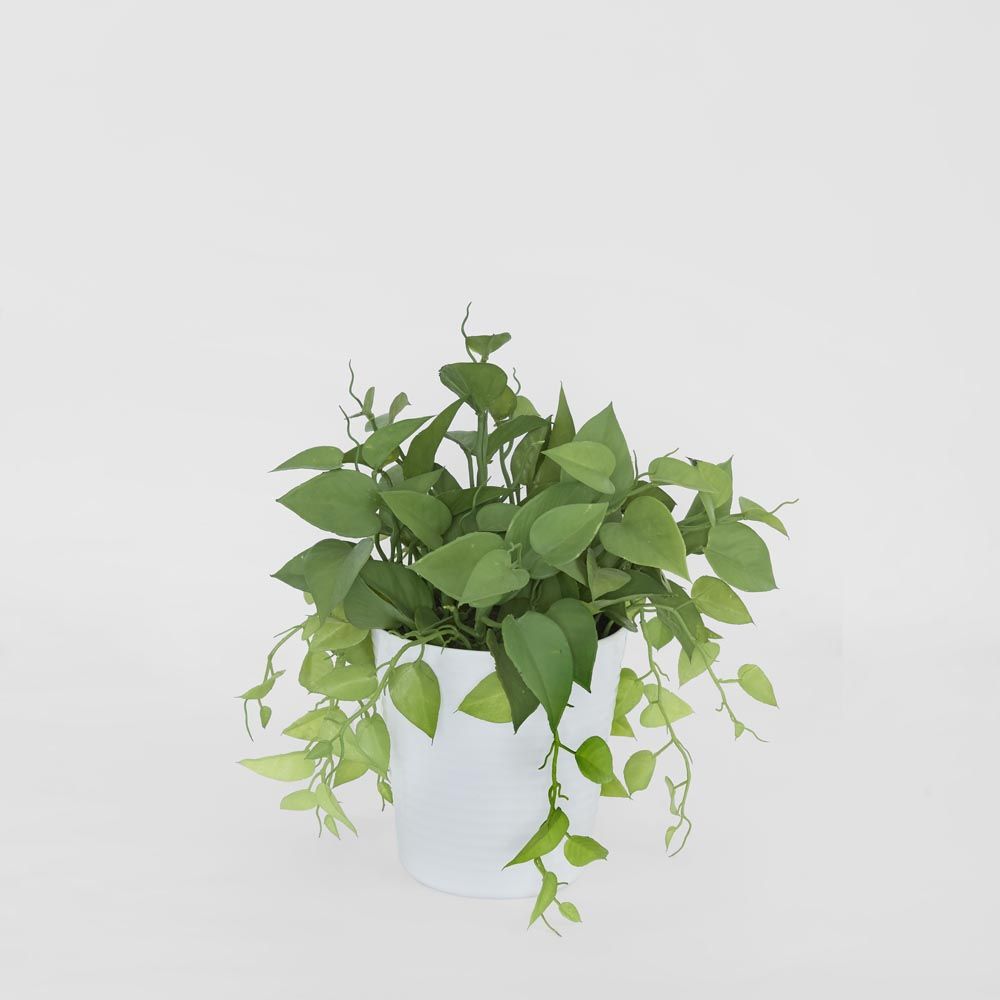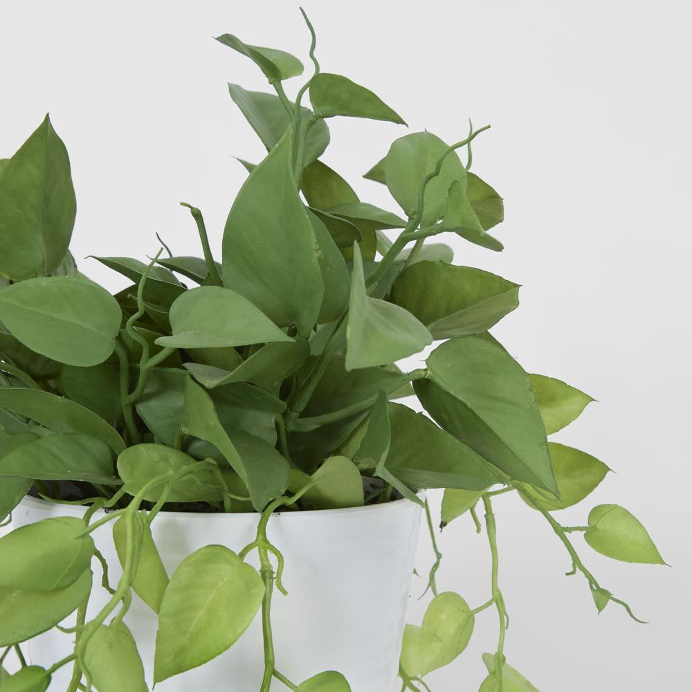 Featuring a cluster of soft leaves with green tendrils overhanging a white pot, this plant is a great for enhancing the ambience of a room. The leaves are arrowhead shaped and have intricate vein detailing. - 35cm tall - Arrowhead shaped leaves - Overhanging leaves with green tendrils - Great space filler Materials: Made of: Plastic, Iron wire and foam