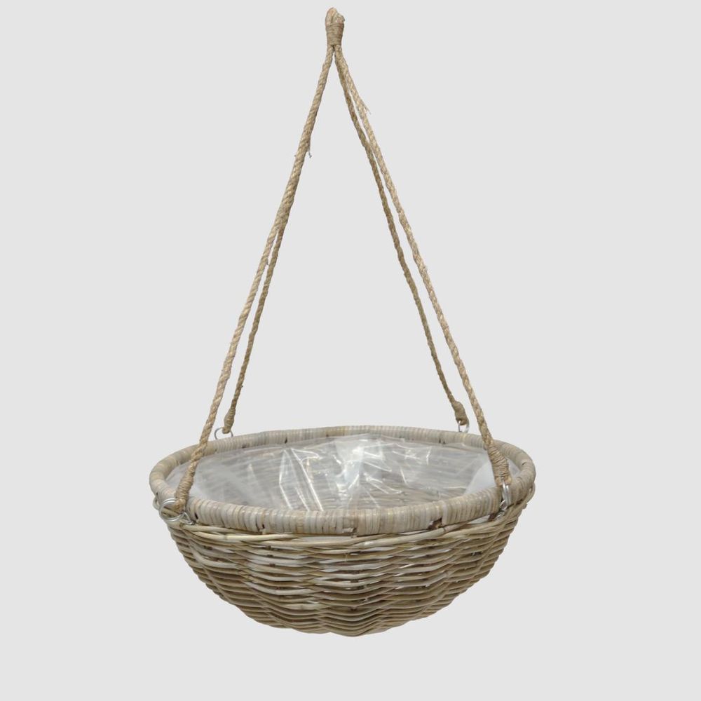 Small Rattan Hanging basket is a fabulous way to display your greenery. This hanging rattan basket is designed with a plastic inner lining to plant into. Greenery such as ferns would look amazing in this hanging woven basket. The round rattan basket is fitted with a tripple chain hanger and hook to make for very easy installation. This large hanging basket make for a standout hanging installation in a conservatory or patio area. Filled with greenery they can change the look of any outdoor patio space. Please note: Rattan is not designed for full outdoor use. If placed outdoors or even in covered outdoor areas, it may weather, fade, or change over time due to exposure to sunlight and moisture. We recommend indoor use or placing it in well-protected areas.