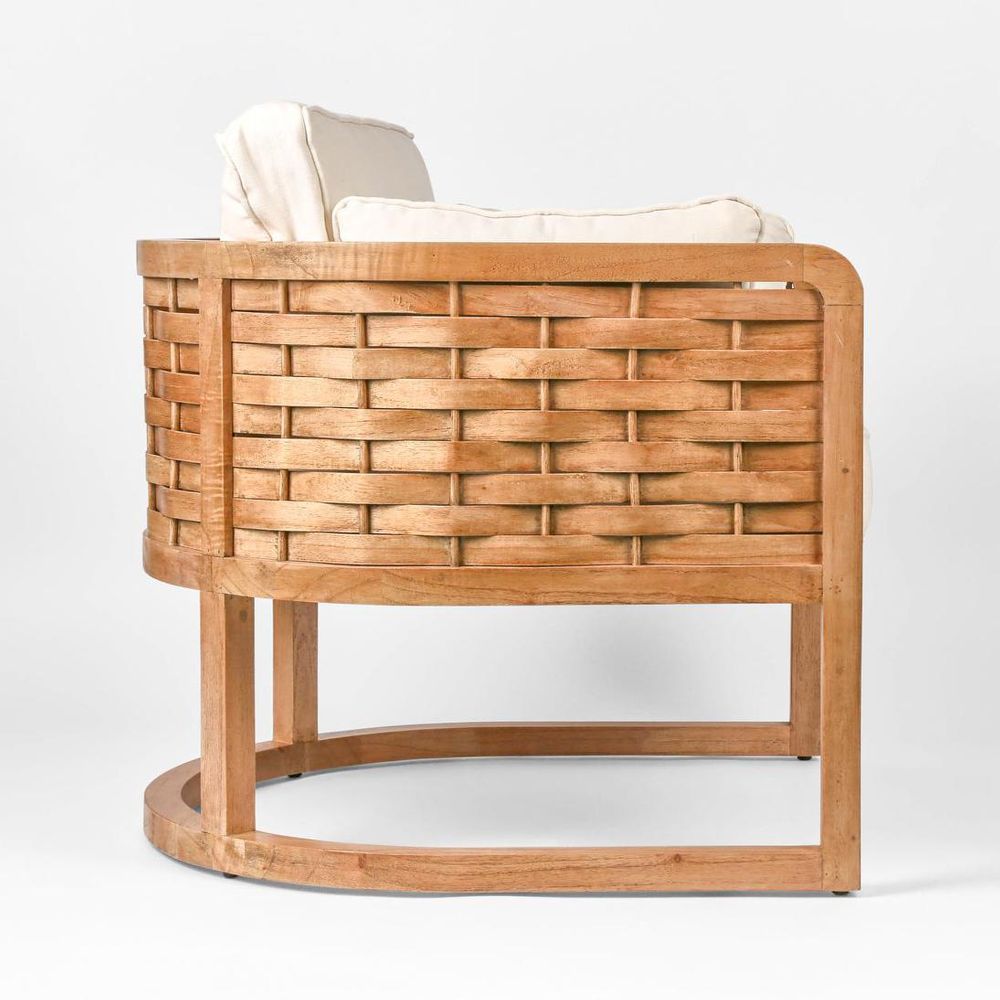Our Weave Occasional Chair is carefully designed and constructed from a curved mango wood frame & inlaid with hand woven wood slats. With soft comfy cushions, sit back and relax in this contemporary chair.