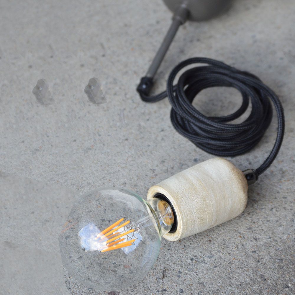 A contemporary wooden cord drop featuring fabric covered cord, and complete with ceiling fixture.