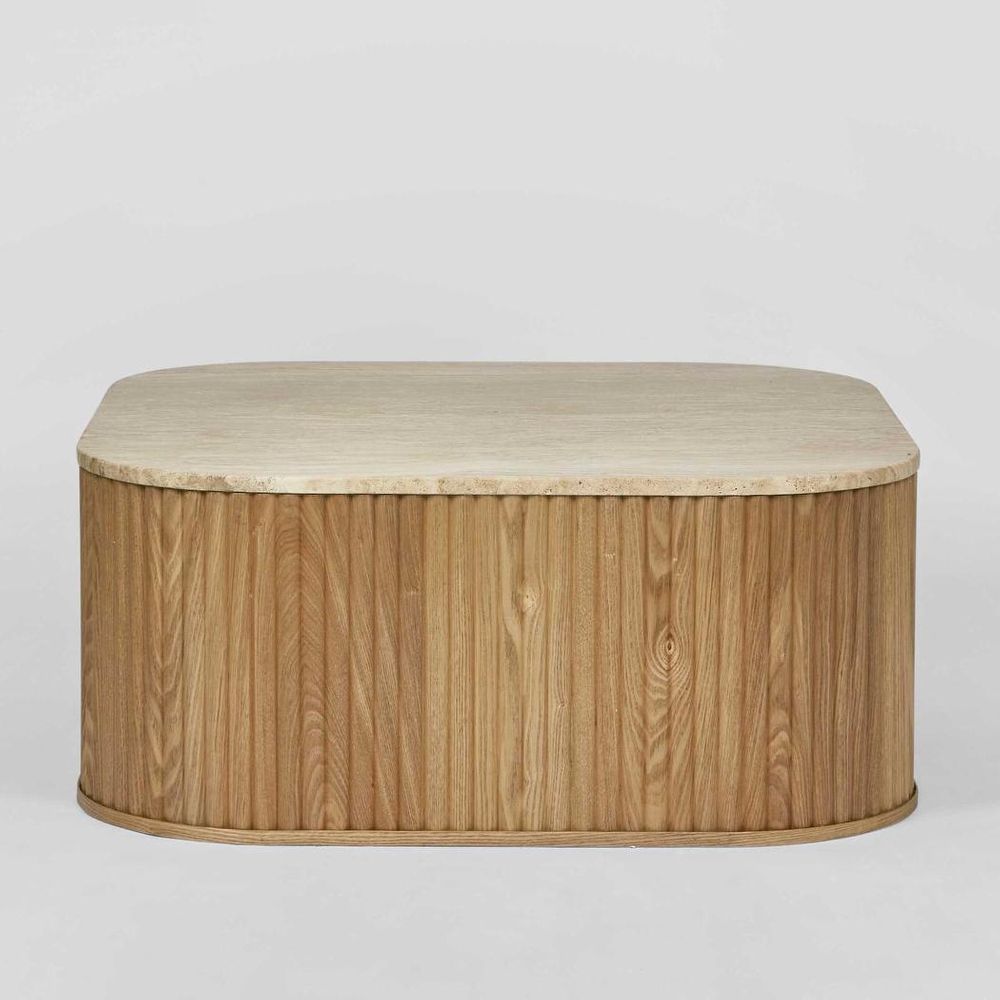 Brew up some serious style in your living room with our Travertine Oak Coffee Table. Crafted with a stunning natural stone top and complemented by an oak veneer base, this table is as much a work of art as it is a functional piece of furniture. Whether serving as a centerpiece in your living area or anchoring your lounge space with its classic-contemporary appeal, it's sure to draw admiration and envy alike. With no assembly required and quick dust with a soft cloth, it's the perfect blend of style and convenience for your modern Montauk retreat. As this is a natural material, each piece will have its own unique characteristics, making every item one of a kind.