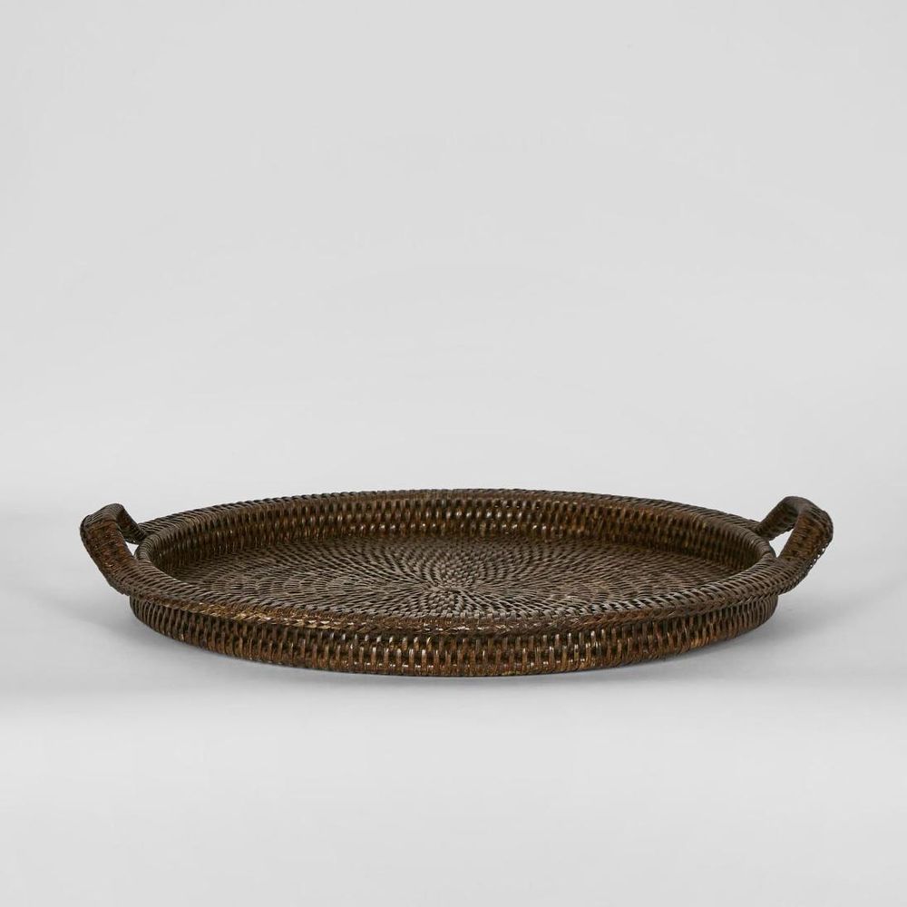 Paume Rattan Round Serving Tray with Handles Antique Brown