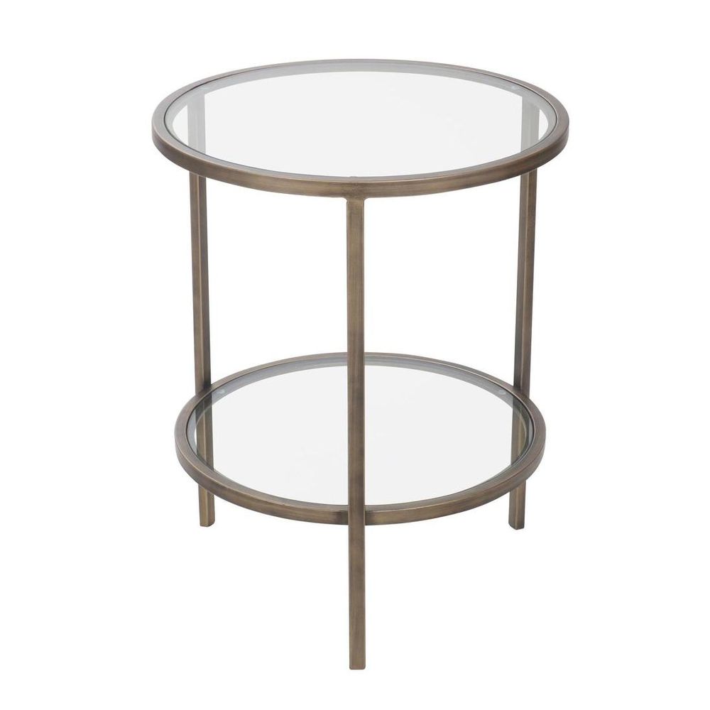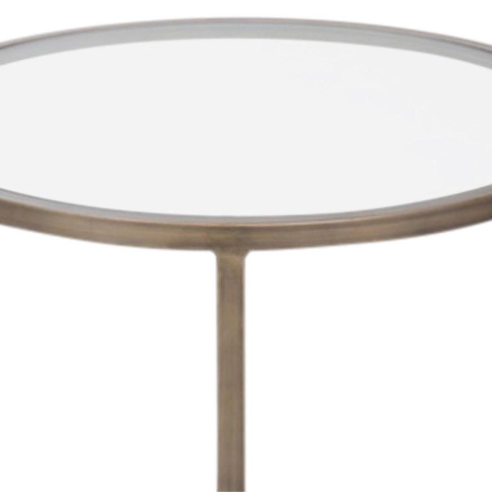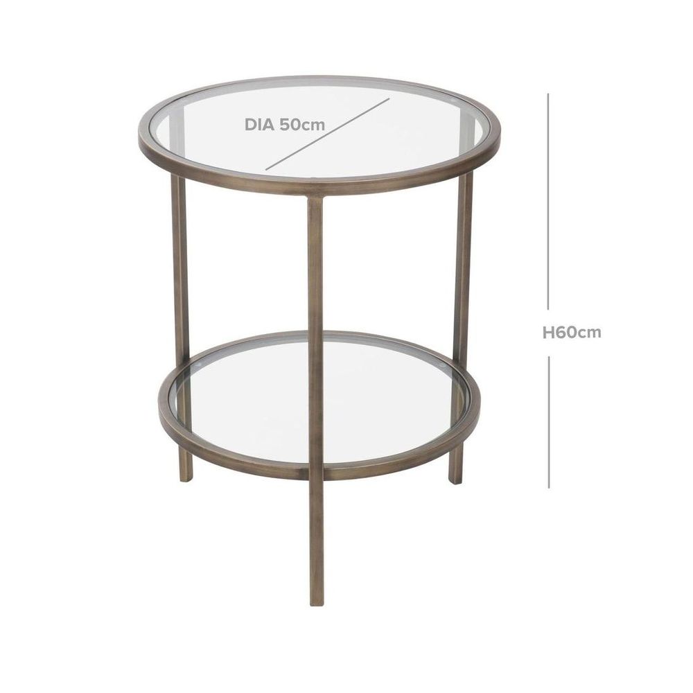 Transform any corner into a stylish vignette with the sleek and minimalist Palladium Glass and Brass Side Table. With its sleek iron frame finished in brass and two-tier glass shelves, this table offers both style and functionality in one compact package. Whether placed next to your sofa as a convenient spot for your coffee cup or adorned with a lamp and vase in your entryway, this versatile piece is sure to enhance any room.