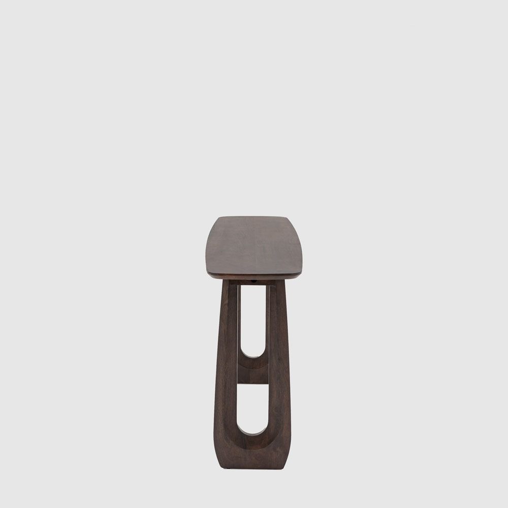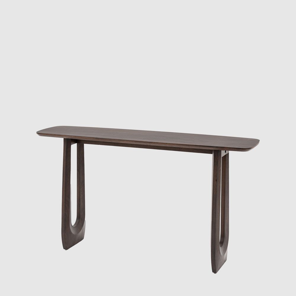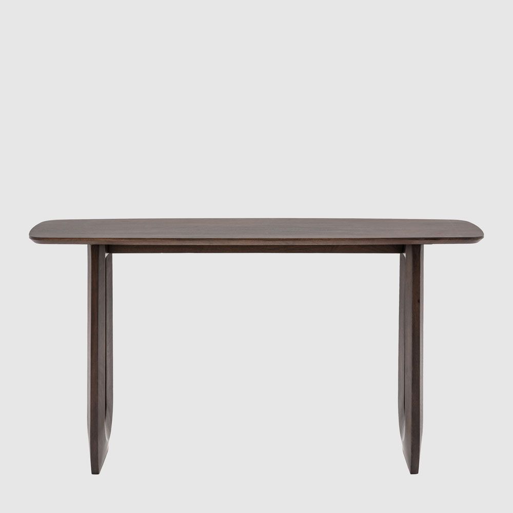 Make a style statement with this bold and beautiful 70s influenced console table. Perfect as either a slim desk or a console table, the dark stained Mango wood is full of rich grains while the eye caching carved U shaped legs add the final touch of retro cool. Each piece is made from high-quality mango wood, celebrating the natural beauty of the material. With distinctive grain patterns, rich tones, and unique markings, no two pieces are exactly alike. These organic variations add character and charm, making each item a one-of-a-kind statement. Designed to embrace the raw elegance of nature, this product brings warmth and authenticity to any space.