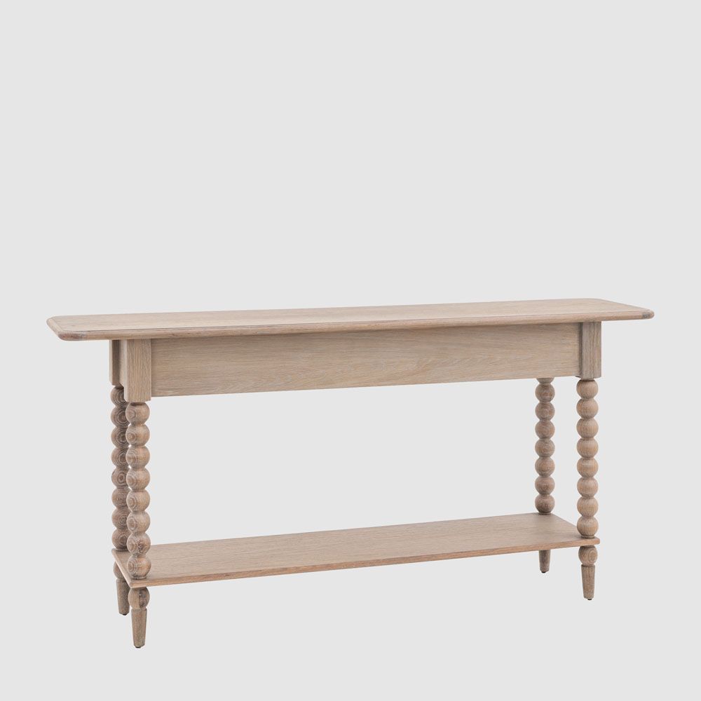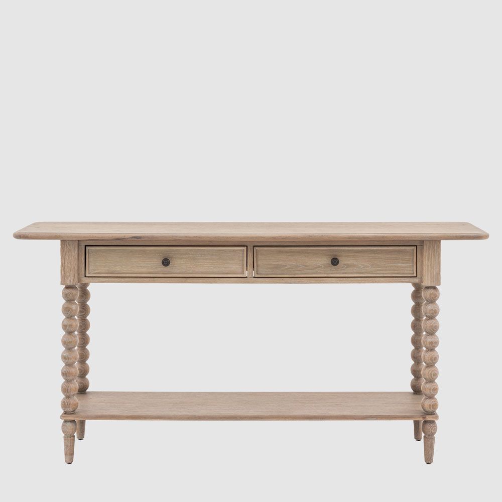 This stunning console table, with its two drawers and lower shelf for added practicality, would make a stylish addition to any interior. The play on a classic look emphasises the hand-crafted bobbin detail down each leg. This eye-catching design feature is created by turning the wood on a lathe, a task carried out by the finest craftsmen. The table is made using beautiful oak solids and veneers where practical, with a very subtle lime wash tone to the finish which is soft and mellow. Matching pieces are available.