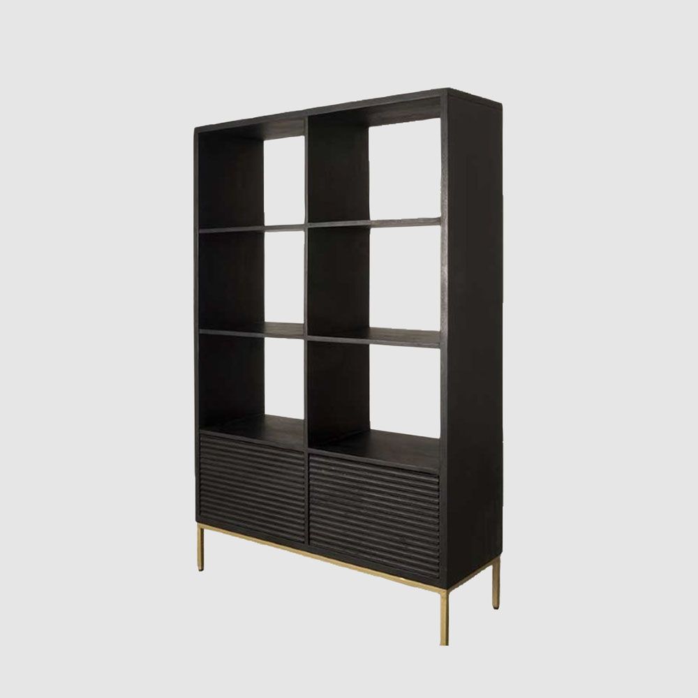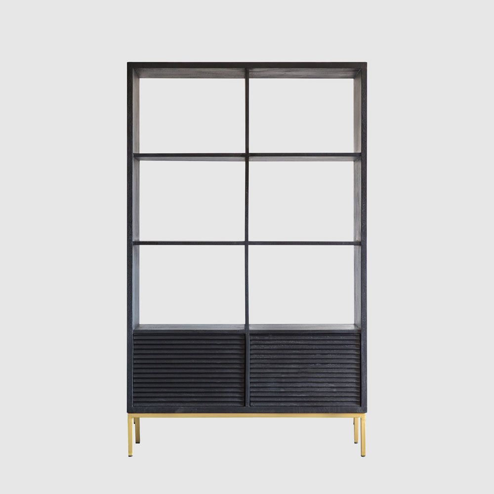 This open display unit features solid mango wood doors in a black finish, routed to create a ripple effect which catches the light, and open shelves, combined with a gold-finish metal base, to give a stylish yet practical unit which looks fantastic as a stand-alone piece or paired with other items from the collection.