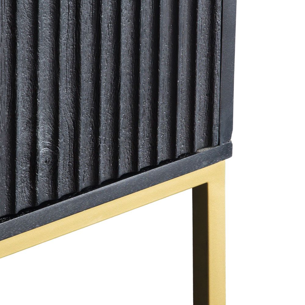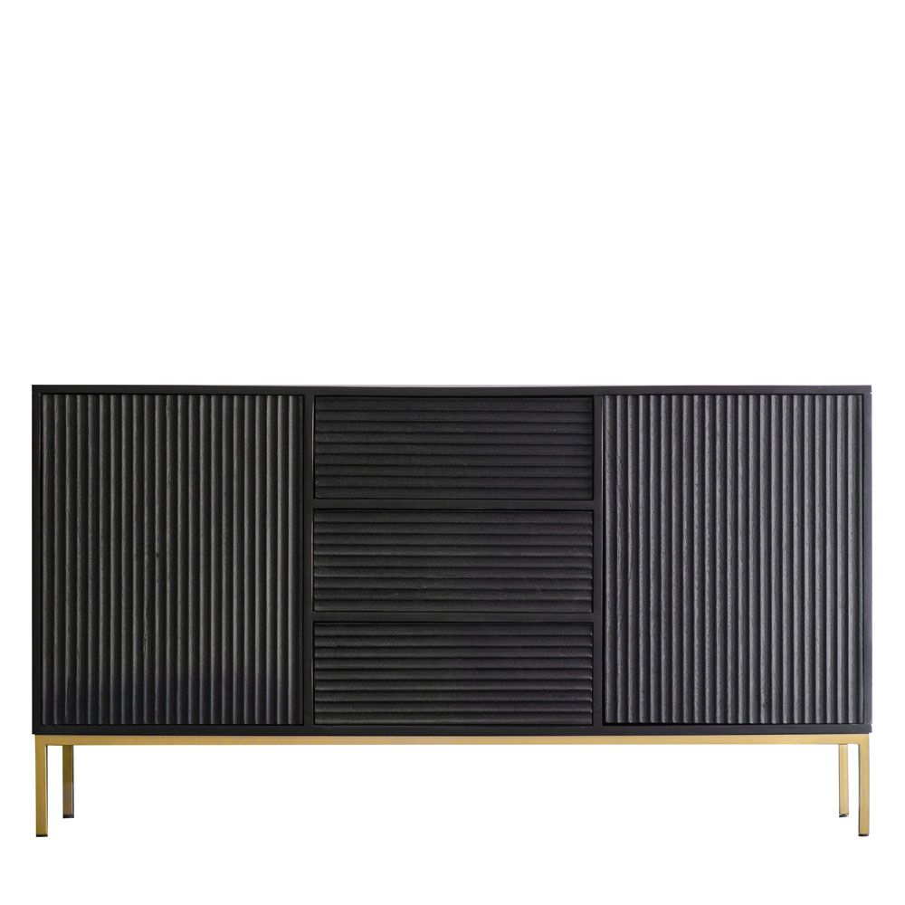 Ideal as a stand-alone piece or paired with other items from the collection, this eye-catching sideboard offers a sophisticated apartment living look. The solid mango wood doors and drawer fronts have a stunning black finish and are routed to create a ripple effect which catches the light, with the ripples running vertically on the doors and horizontally on the drawers to add even more interest. To complete the look, the black mango wood is combined with a gold-finish metal base, to add a touch of glamour.