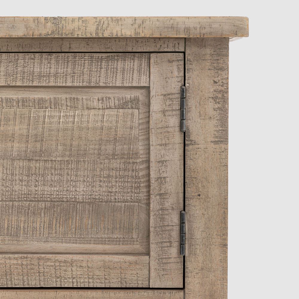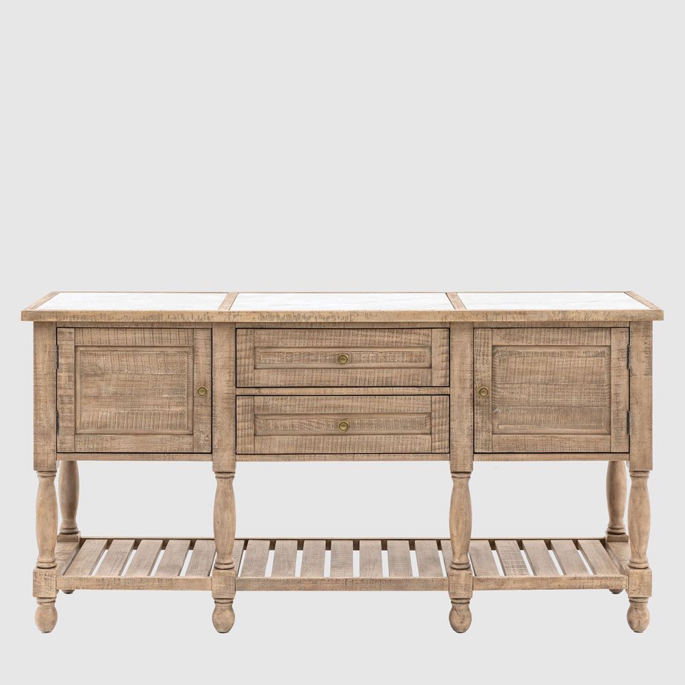 Offering an updated classic look, this stunning sideboard features inset marble on the top along with two cupboards, two drawers and a large shelf to give practical storage combined with a stylish sophisticated yet rustic look. It is crafted from North American pine solids and veneers where practical, with the clever use of a mill saw giving characteristic features of cross sawn timber to create a tactile, dramatic finish. Matching pieces are available.