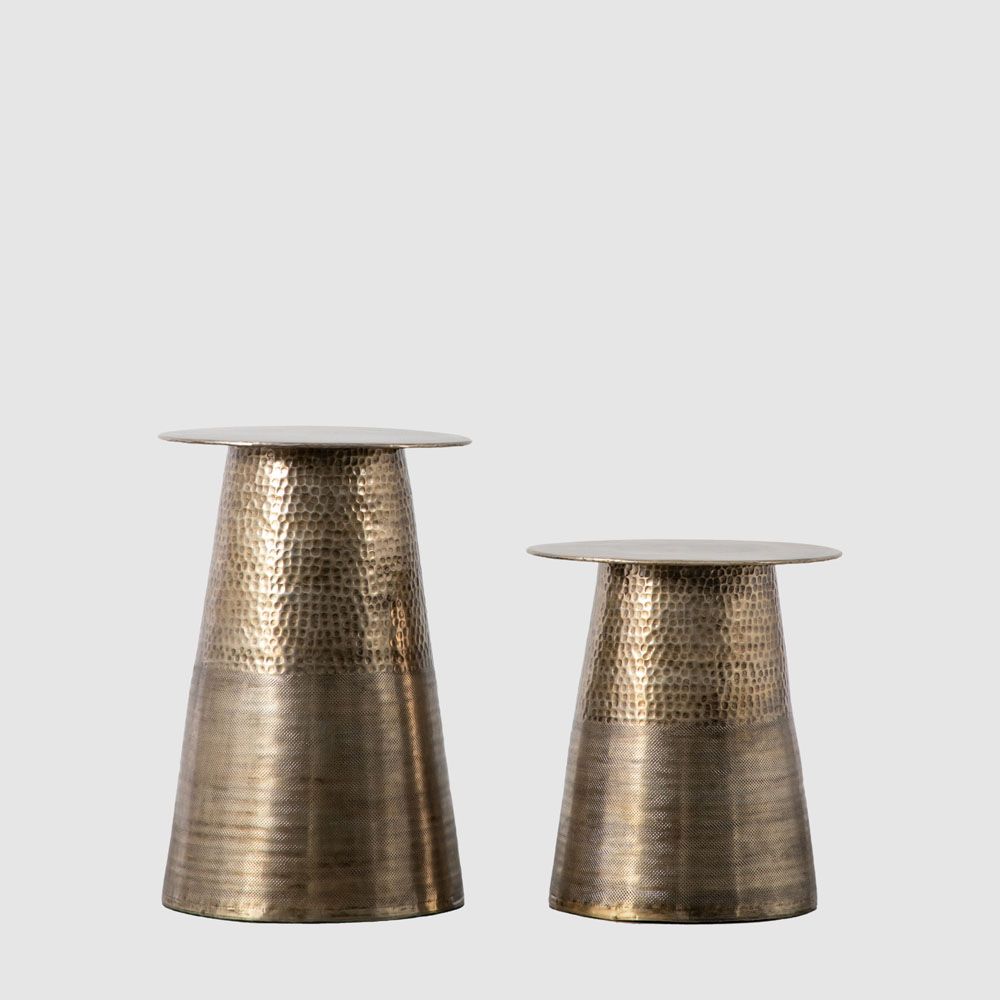 Set of two side tables offering artisanal style with a contemporary twist. The unusual shape of the tables is complemented by the hammered texture on the top area of the bases and the finish to the metal.