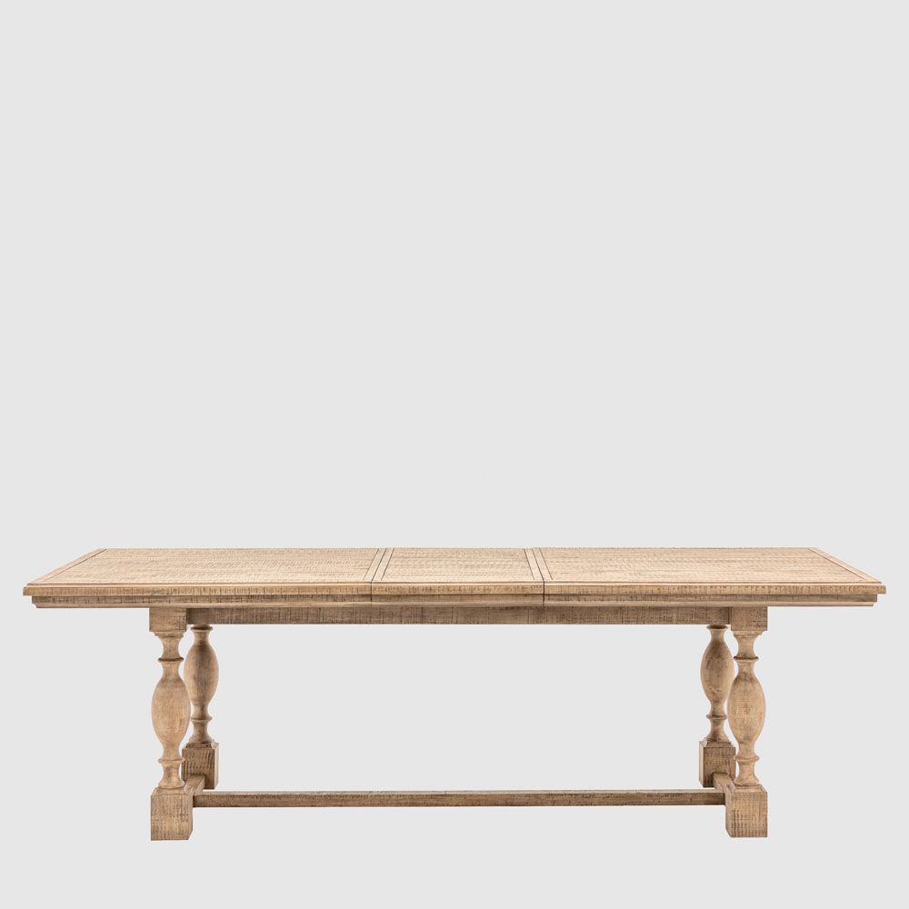 This beautiful dining table offers an updated classic look and is ideal for larger spaces, extending when needed to create more seating space. It is crafted from North American pine solids and veneers where practical, with the clever use of a mill saw giving characteristic features of cross sawn timber to create a tactile, dramatic finish. Matching pieces are available.