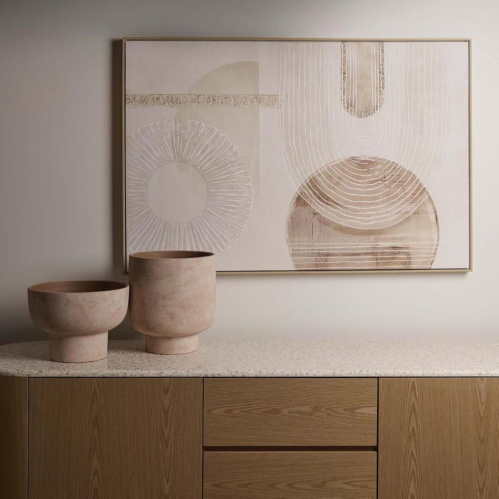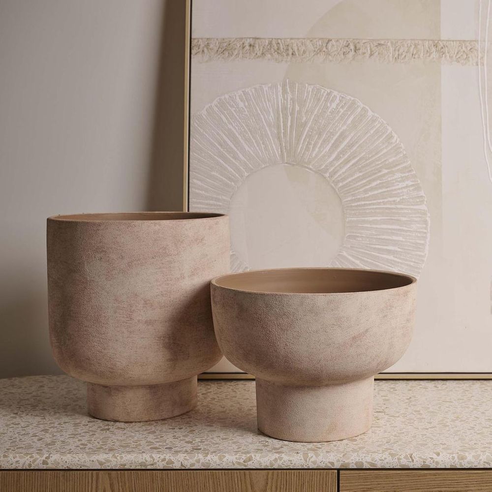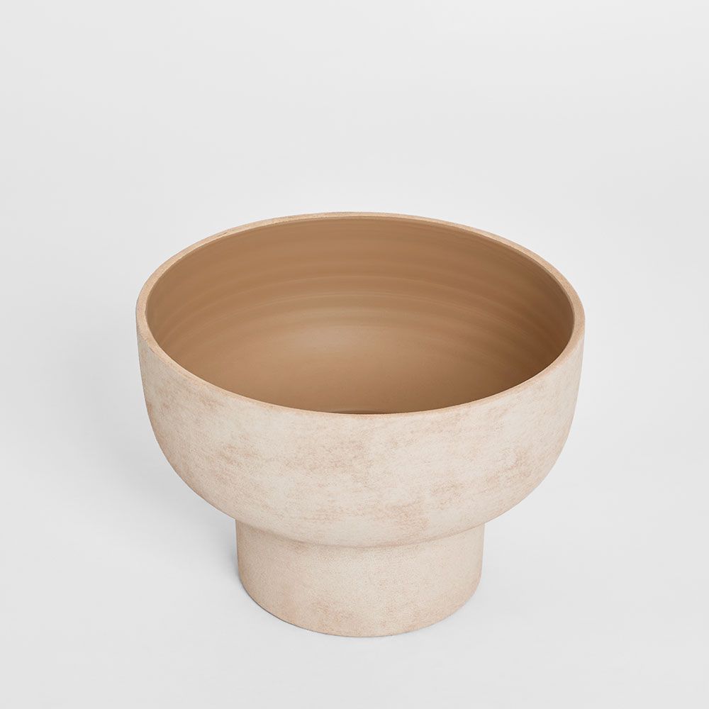 Crafted with a clean, modern silhouette, this pedestal pot brings a touch of refined simplicity to any space. Featuring a wide, rounded bowl balanced on a cylindrical base, it offers both stability and sculptural appeal. The soft beige textured exterior with a natural, matte finish complements a variety of interiors, while the smooth, warm-toned interior adds depth and contrast. This pot includes a drainage hole.