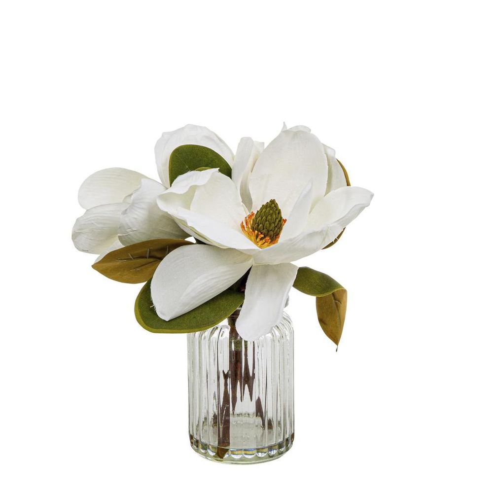 Brighten up any room with our artificial Magnolia in Glass Vase. These large, showy blooms boast thick petals that elegantly unfurl in a magnificent white hue, resembling delicate cups of natural beauty. Adorned with a cluster of stamens at their center, they create a mesmerizing focal point. Perfect for tabletops, mantels, or any space in need of a touch of elegance, this lifelike arrangement adds a captivating charm to your decor.