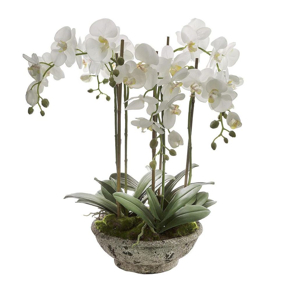 Step into everlasting springtime with our artificial Orchid in Pot. Delicate white blooms and green buds dance atop slender stems, bringing a touch of floral finesse to your space year-round. Planted in a distressed pot with exposed roots, glossy leaves, and vibrant moss, it's the perfect illusion of nature's beauty without the maintenance.