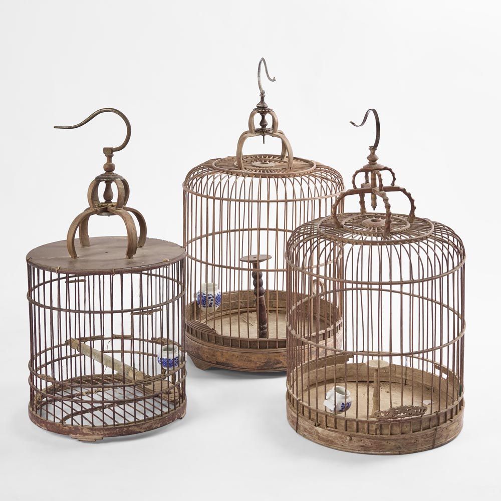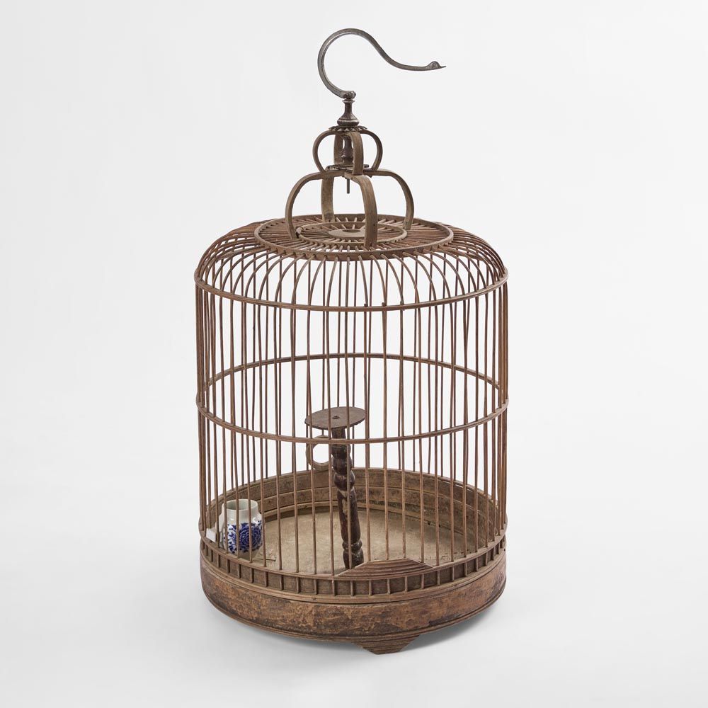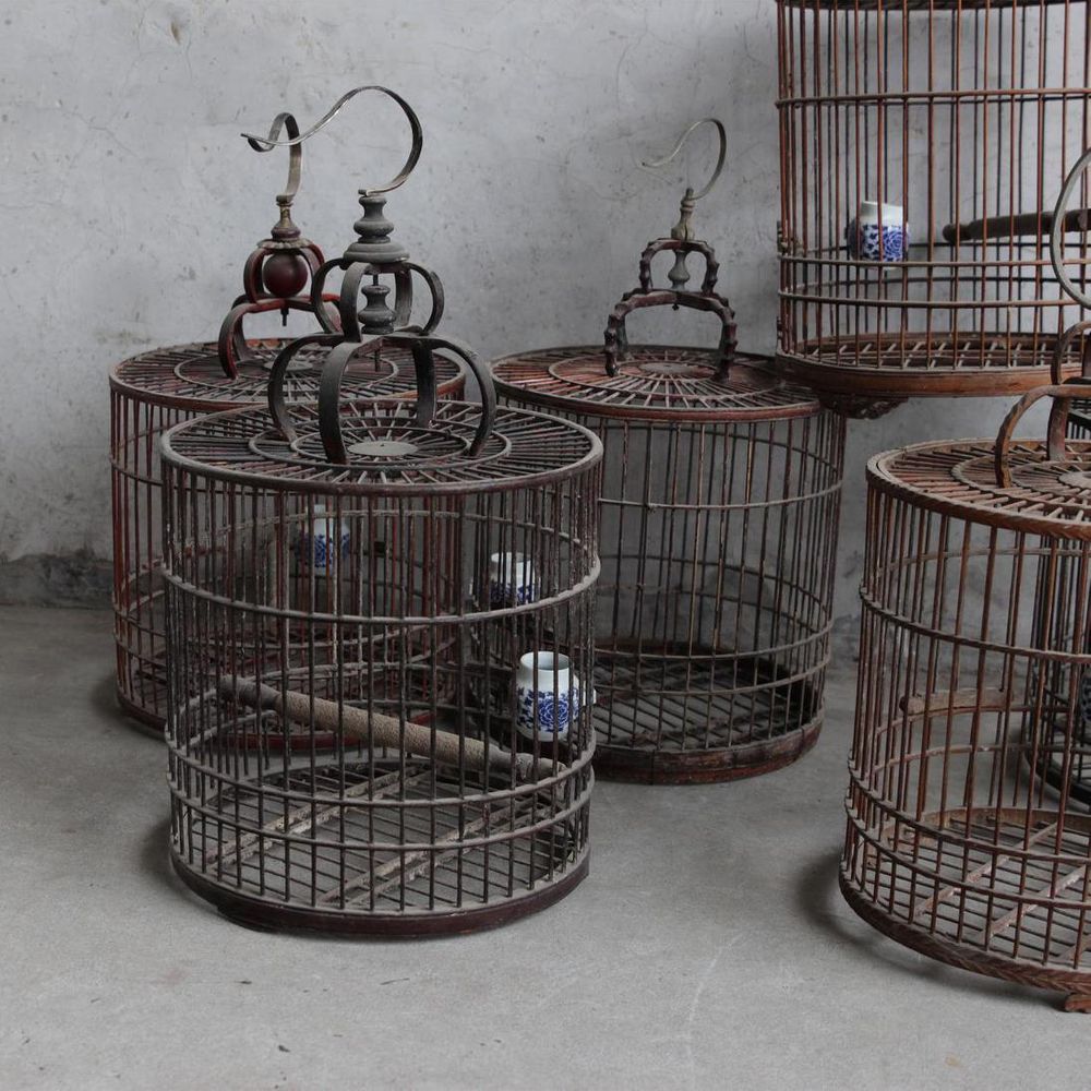 Beautiful and still very functional, these bamboo birdcages collected from around the sprawling capital of China are unique in design, size and finish. Featuring traditional blue and white Chinese porcelain food and water bowls and iron finials and hooks, they are an exquisite addition to any interior setting.