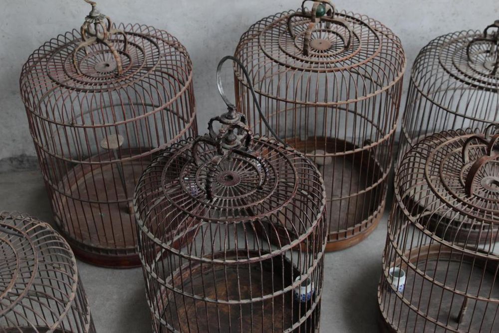 Beautiful and still very functional, these bamboo birdcages collected from around the sprawling capital of China are unique in design, size and finish. Featuring traditional blue and white Chinese porcelain food and water bowls and iron finials and hooks, they are an exquisite addition to any interior setting.