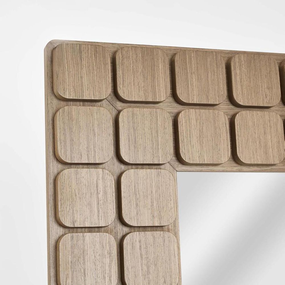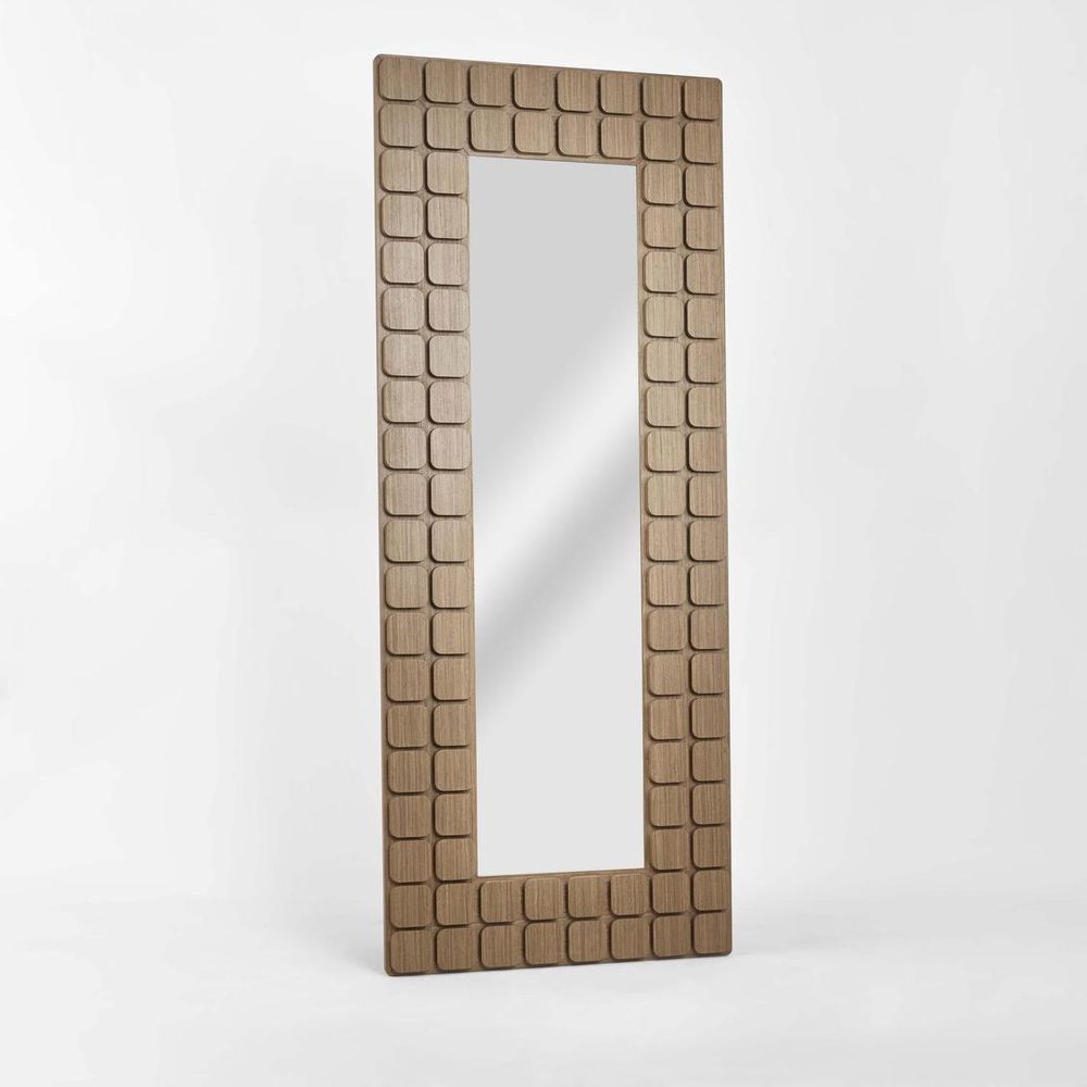 The Porto Floor Mirror is a combination of clean lines and rhythmic block detailing gives it a mid-century / contemporary feel – architectural but still warm and organic. The frame is built from warm-toned wood and finished with a repeating pattern of soft-edged, square “block” tiles. Each block has visible vertical grain, giving the frame a sculpted, three-dimensional look. Ideal as a floor mirror for bedrooms, dressing areas or entryways.