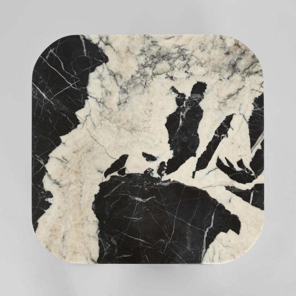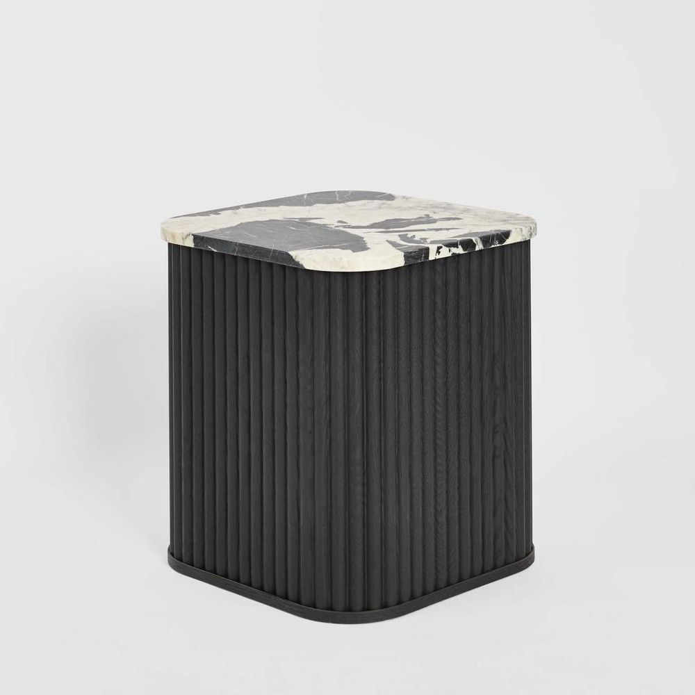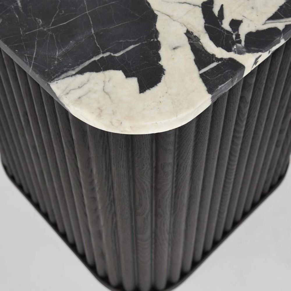 The Noir Side Table brings a bold, gallery-worthy presence to you living space. A striking black-and-white marble top with dramatic veining sits over a rounded black oak base, finished with rhythmic vertical fluting for added texture and shadow play.