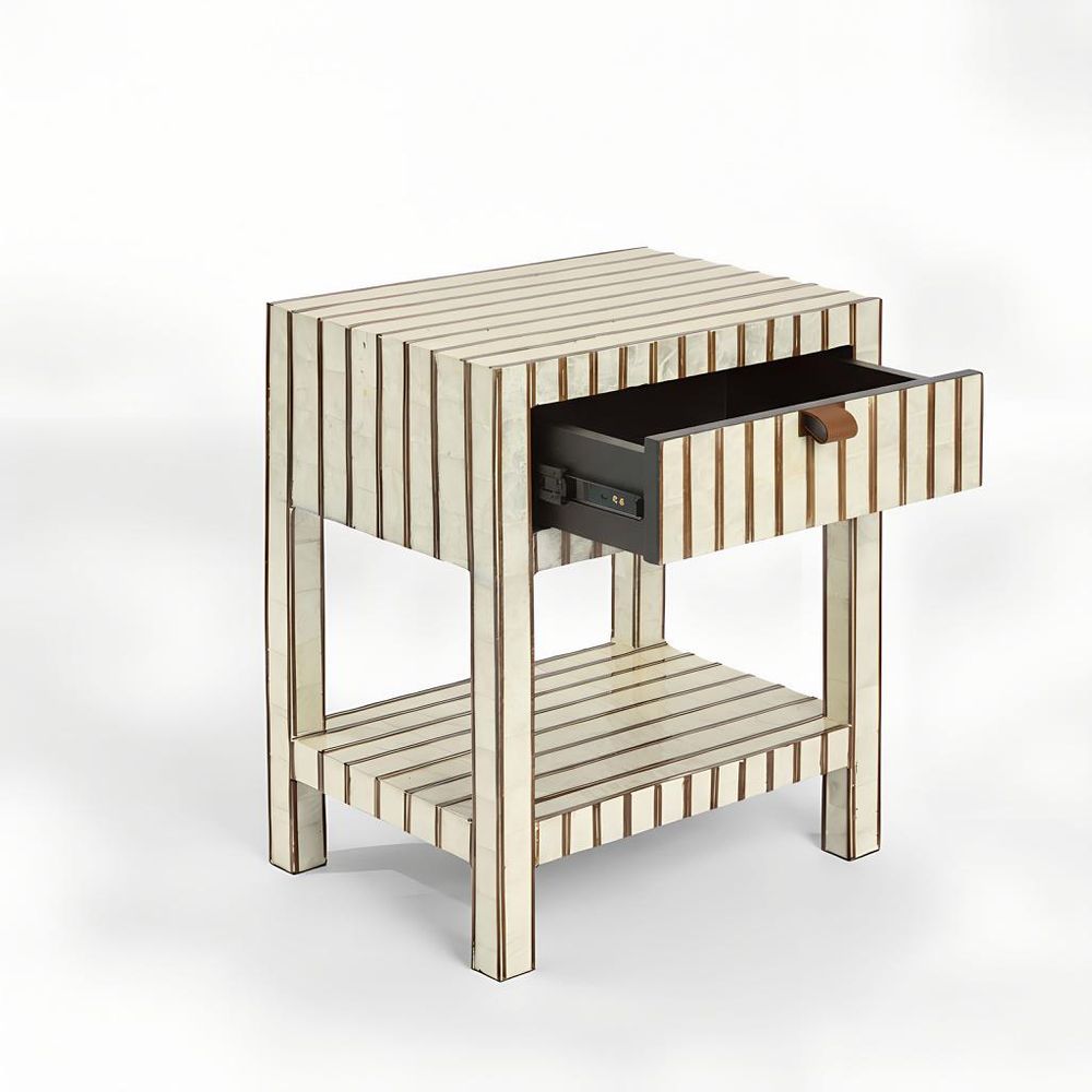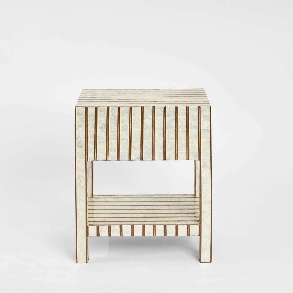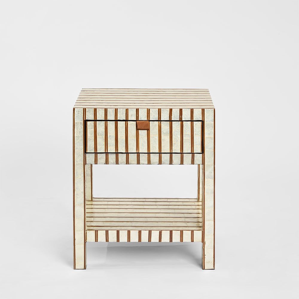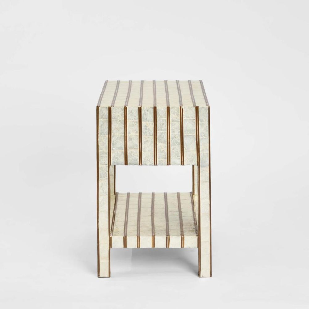 Raya Bedside features a handy top drawer and lower shelf for extra storage. Crafted with precision the entire surface is meticulously clad in natural capiz shell, offering a subtle iridescent sheen that shifts beautifully with changing light. Delicate bamboo inlay lines adding a layer of glamour and craftsmanship.