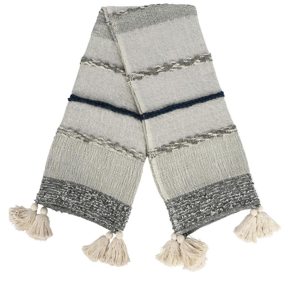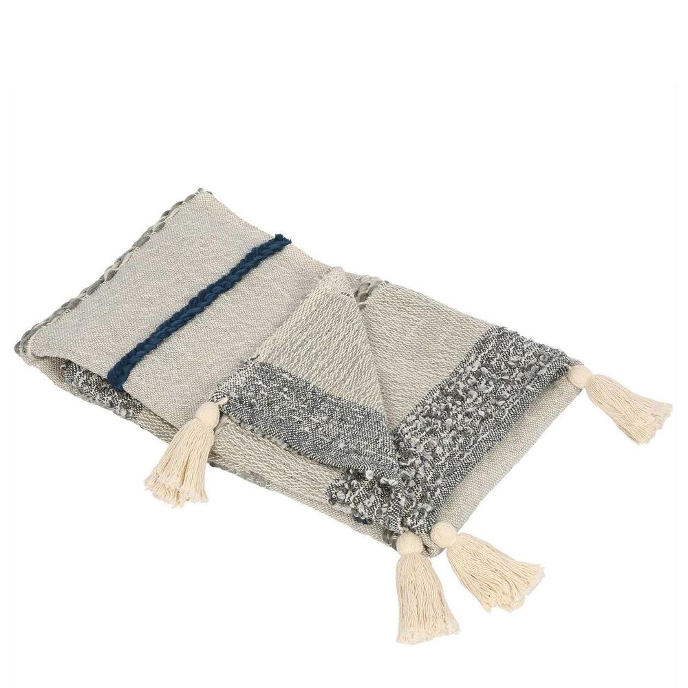 The Oslo throw is a medium weight throw made from a cotton and acrylic blend. Tones of grey & blue woven detailing with cream tassels.