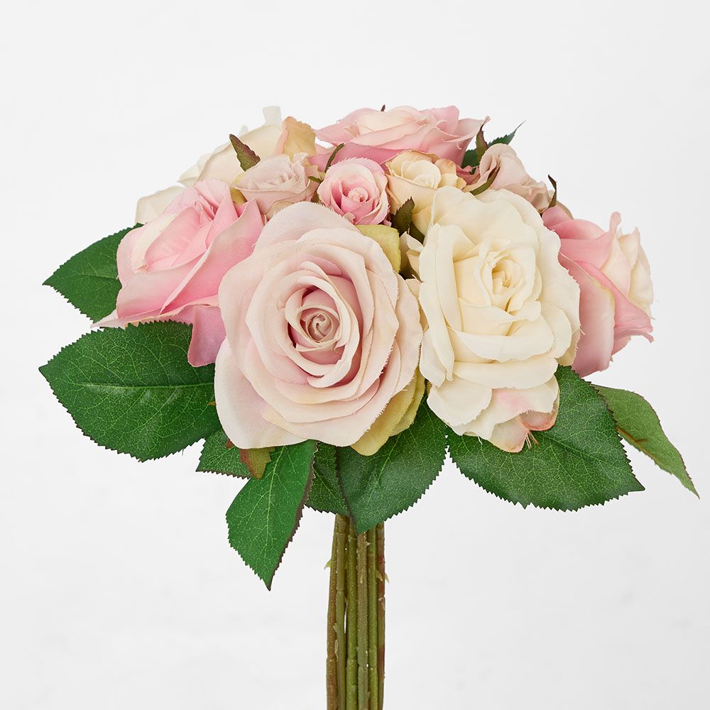 Prepare to bloom with brilliance with our artificial Rose Bouquet. This captivating bouquet features cream-colored blooms with a subtle pinkish hue, perfectly complemented by vibrant green serrated leaves. Whether placed in a vase as a standalone centerpiece or incorporated into larger floral arrangements, it adds a touch of sophistication and natural beauty to any space or event.