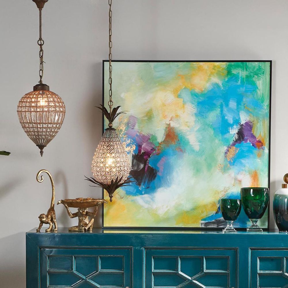 Our Picasso is exquisite crystal glass chandelier pendant light with hand-cut beveled glasses shaped like crystal pineapple glass and metal leaves. The brass has patina to look like old world vintage traditional appearance. It has a vintage style and an atmosphere reminiscent of the French lights of the Versailles palaces. The light shades out of the chandelier will look beautiful anywhere to make our guests to feel welcome in our home. ADDITIONAL FEATURES • Standard Australian domestic fitting • Ceiling rose has a matching finish with the base • 1.5m chain and cord height is adjustable • Lamp holder takes a standard E14 light bulb at 40 watt max Please note that most glass components are handmade and therefore small air bubbles, slight defects and colour variations may naturally occur during the glassblowing process. [download spec sheet] Recommend Lighting Source : LED Only