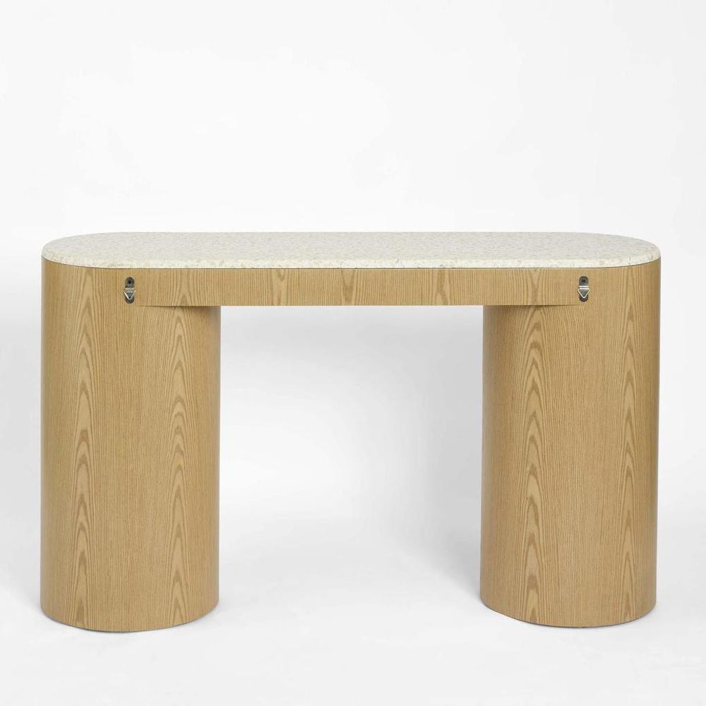 Arlo Console featuring cylindrical oak veneer legs and a terrazzo stone top. The soft, rounded silhouette combines natural materials and clean lines to create a timeless and contemporary aesthetic. Perfect as an entryway or accent piece, the design celebrates material contrast and craftsmanship.