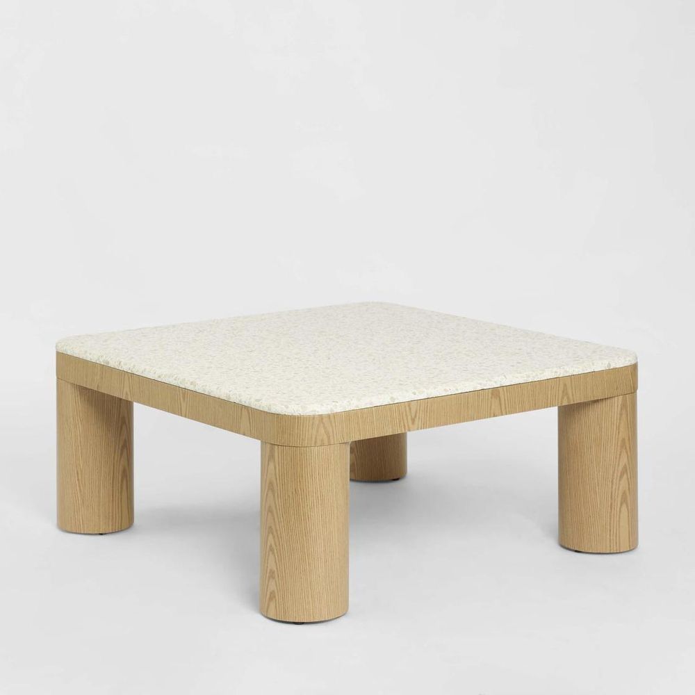 Arlo Coffee Table featuring a square terrazzo top supported by cylindrical oak legs. Its soft edges and clean geometry highlight the beauty of natural materials. The form is bold yet minimal — a perfect balance of playful geometry and refined craftsmanship.