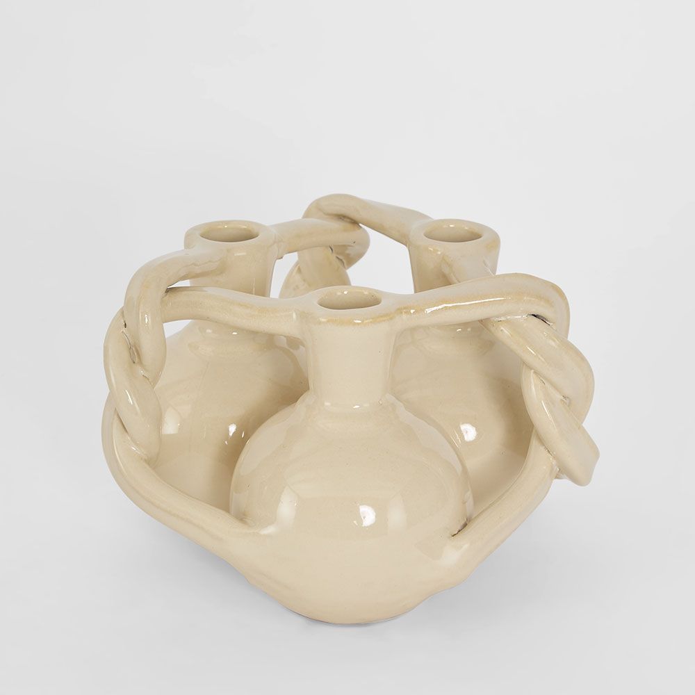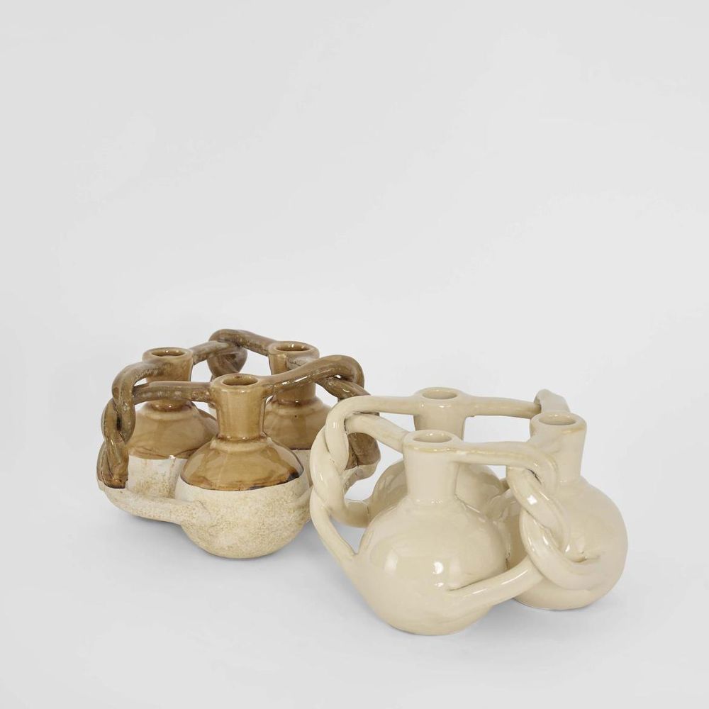 This artistic bud vase features an intricate intertwined design with delicate openings, creating a sense of movement and texture. Perfect for single stems or small floral arrangements, it doubles as a sculptural accent, adding a touch of elegance and visual intrigue to any space. Available in Mustard with white Glaze & White Glaze Water-resistant, however, due to the handmade nature and characteristics of the materials, complete waterproofing cannot be guaranteed. Watertight: N Drain hole or Plug: N Top opening diameter: 2cm