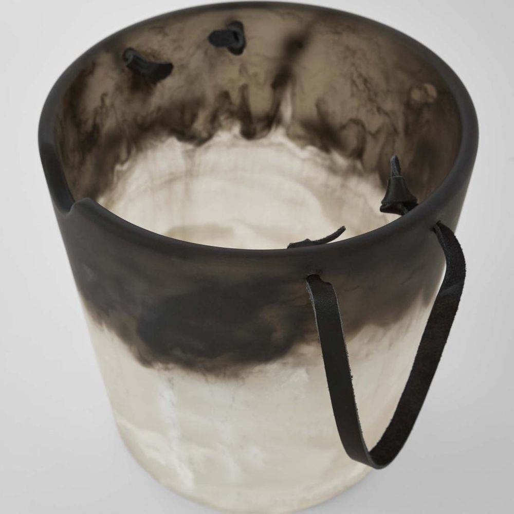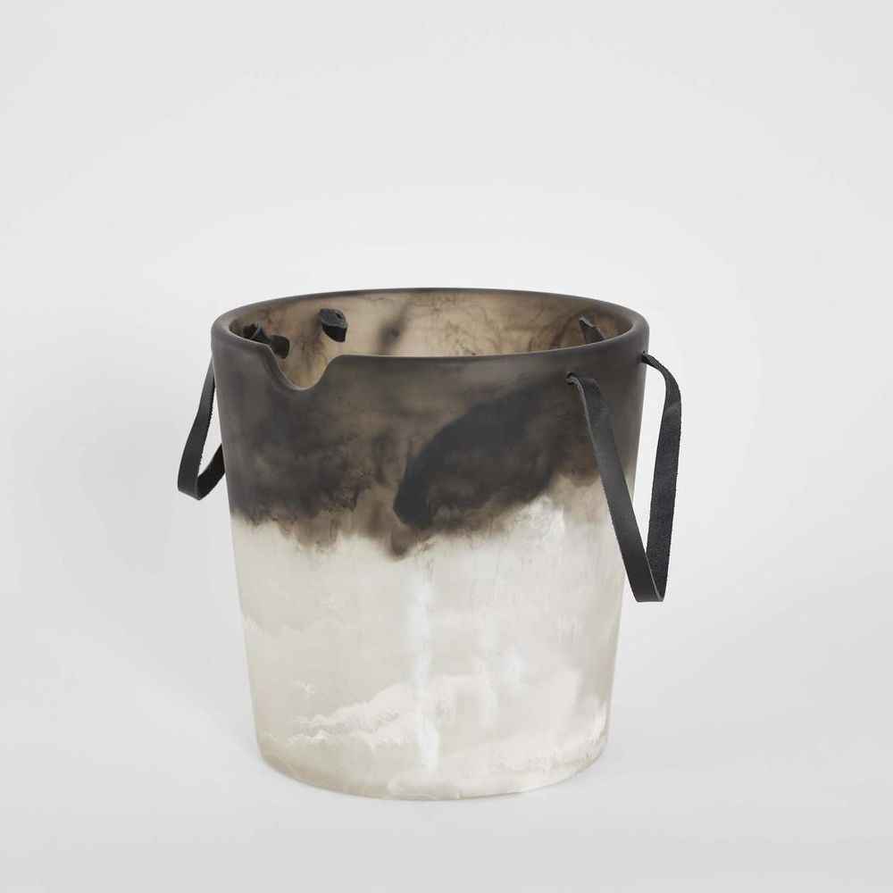 Handcrafted from resin, this ice bucket blends has leather handles, smooth curves with a luminous finish. Its form and texture create a subtle statement while keeping your bottle perfectly chilled. Each piece is unique, with natural variations in color and surface that celebrate its handmade quality. Not microwave safe, not dishwasher safe, not oven safe, not freezer safe. This item is hand-made - Minor variations to the product images in colour & tone are inherent characteristic of the production process