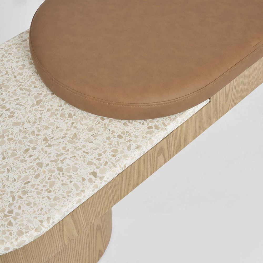 A sculptural mixed-material bench combining a solid oak base with cylindrical legs, a tan PU leather cushion, and a terrazzo stone accent top. Designed for both function and form, its balanced composition brings warmth, texture, and modern sophistication to any space.Floor clearance: 29cm