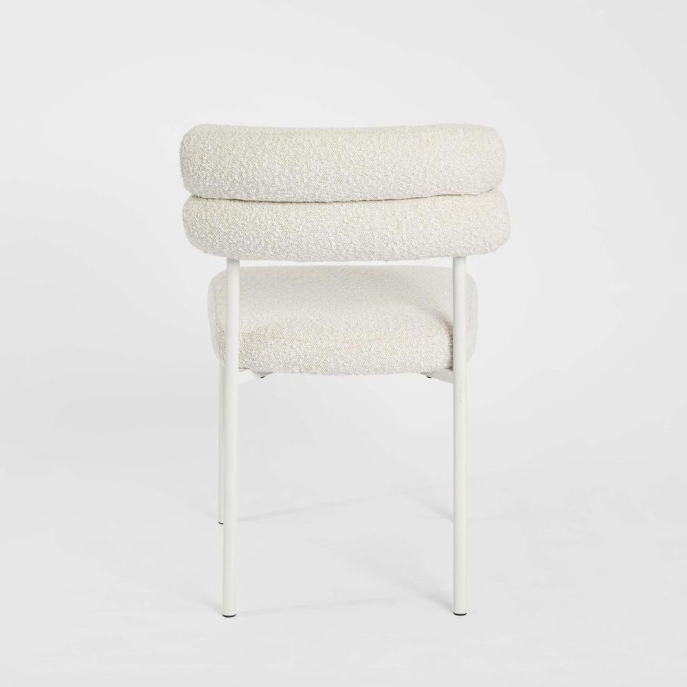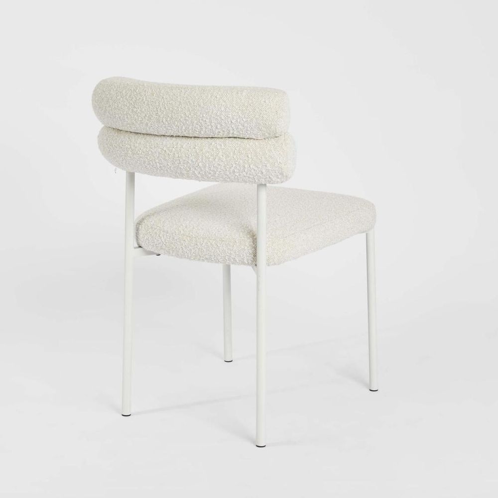 Effortlessly chic and playfully modern, the Ariana Dining Chair blends soft texture with clean, contemporary lines. Upholstered in a plush off-white boucle fabric, the chair’s rounded double roll-backrest design offers a subtle nod to mid-century styling while maintaining a fresh, minimalist appeal. The powder-coated metal frame in matching white provides a sleek contrast to the tactile upholstery, creating a light, airy presence perfect for modern dining or studio spaces. Minimum order quantity 2pcs
