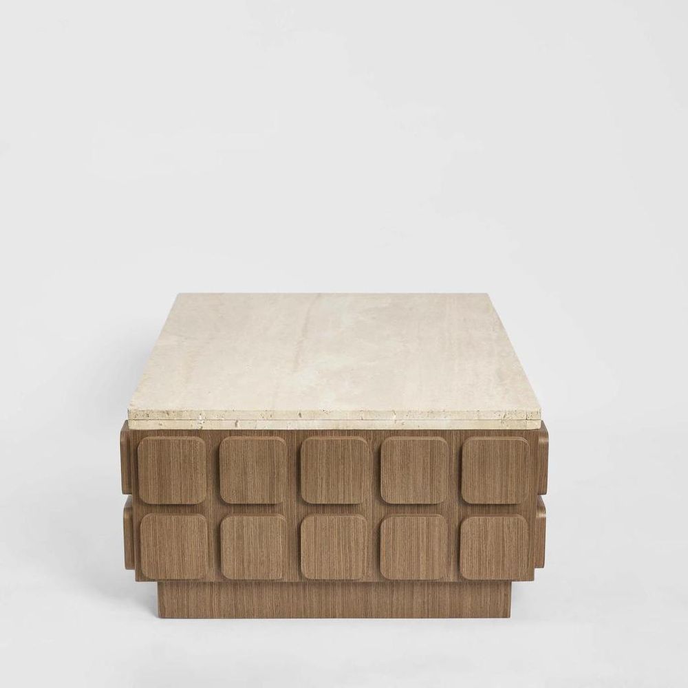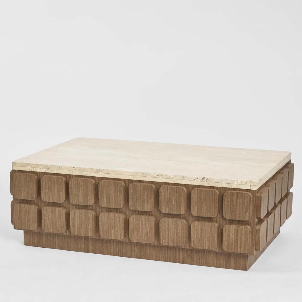 The Porto Coffee Table is a bold, architectural centrepiece that brings depth, texture and quiet luxury to any living space. The top features a smooth, polished stone surface in soft neutral tones. The solid timber base is meticulously crafted with a repeating series of soft-edged square blocks, creating a three-dimensional, almost tiled effect. The vertical grain of the wood adds another layer of texture, enhancing its natural character.