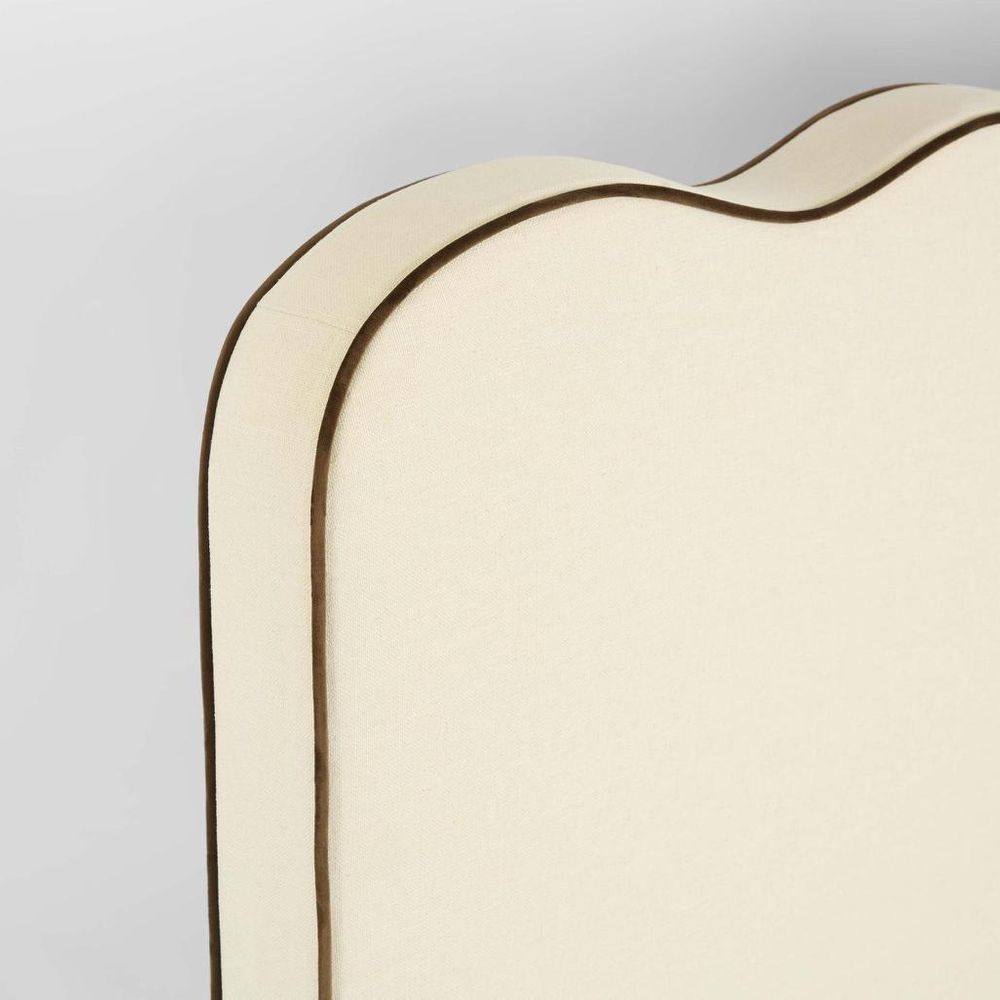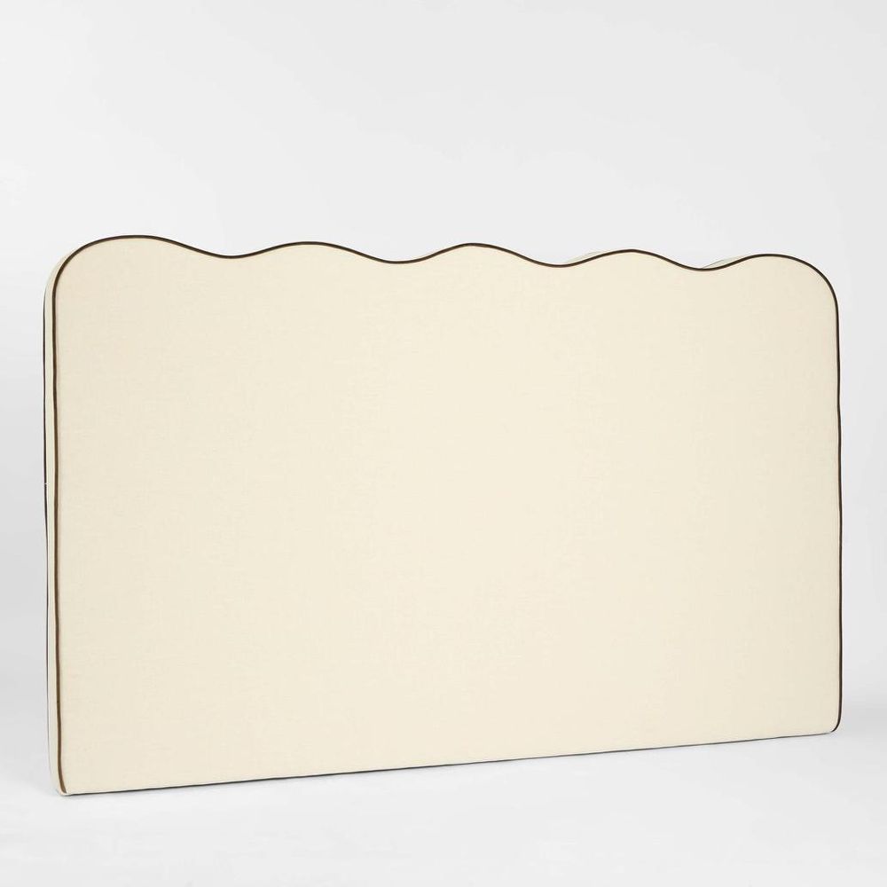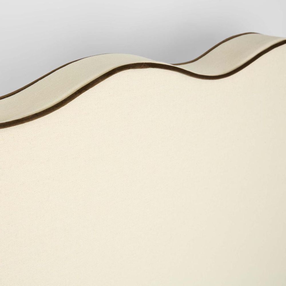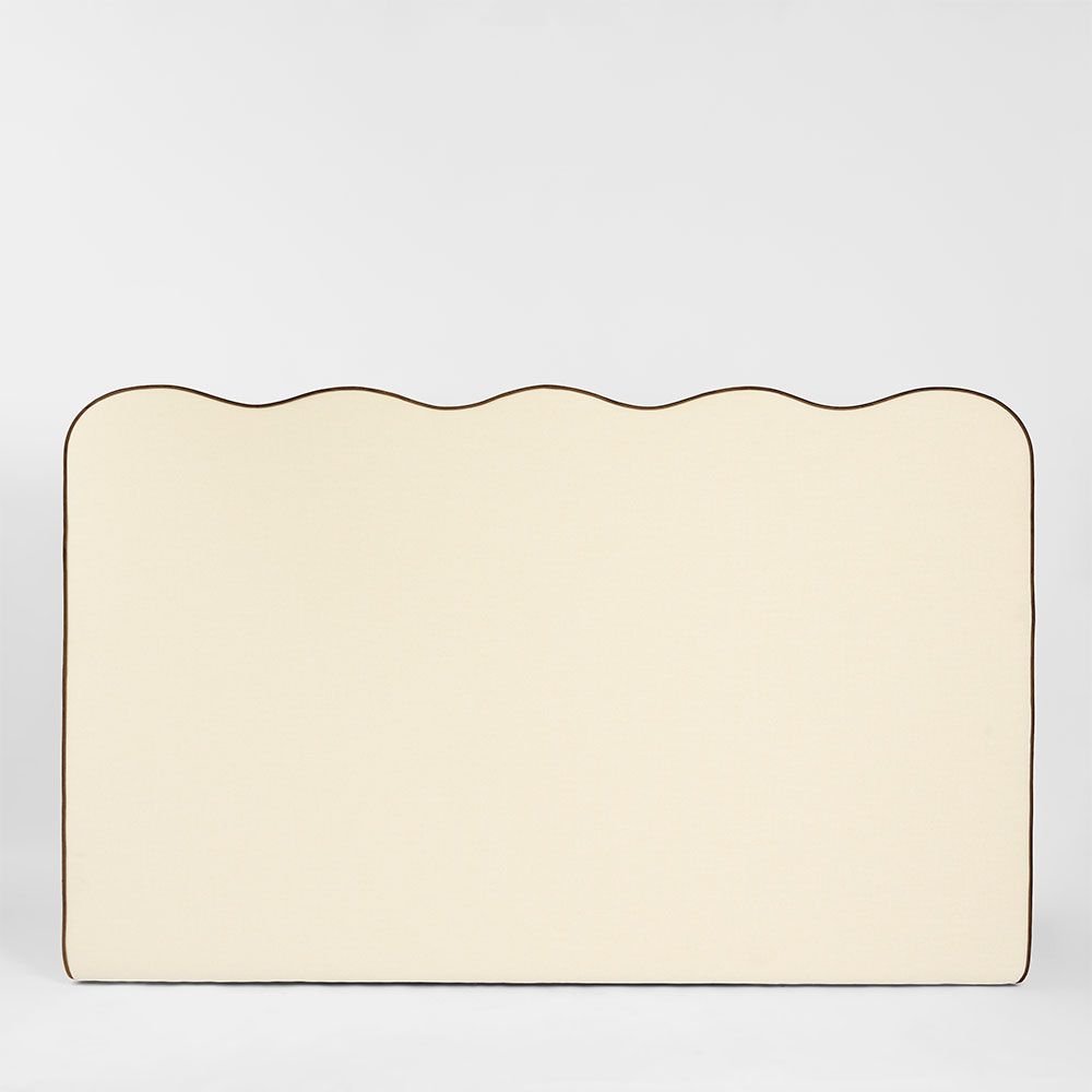 Elevate your bedroom with the Avoca King Bedhead, a statement piece that combines elegance and comfort. Upholstered in soft ivory fabric, it is beautifully accented with rich chocolate piping for a refined contrast. The standout feature is its scallop wave top, adding a graceful, flowing silhouette that brings both sophistication and charm to your space. This king bedhead combines comfort and design, making your bed the centerpiece of the room. Floor Clearance: 3cm