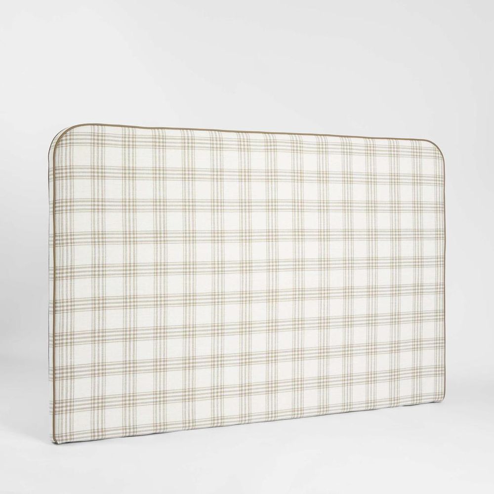 A tailored upholstered headboard featuring soft neutral plaid fabric accented with tan leather piping. Its rounded corners and refined detailing evoke a sense of timeless craftsmanship, blending classic patterning with modern simplicity