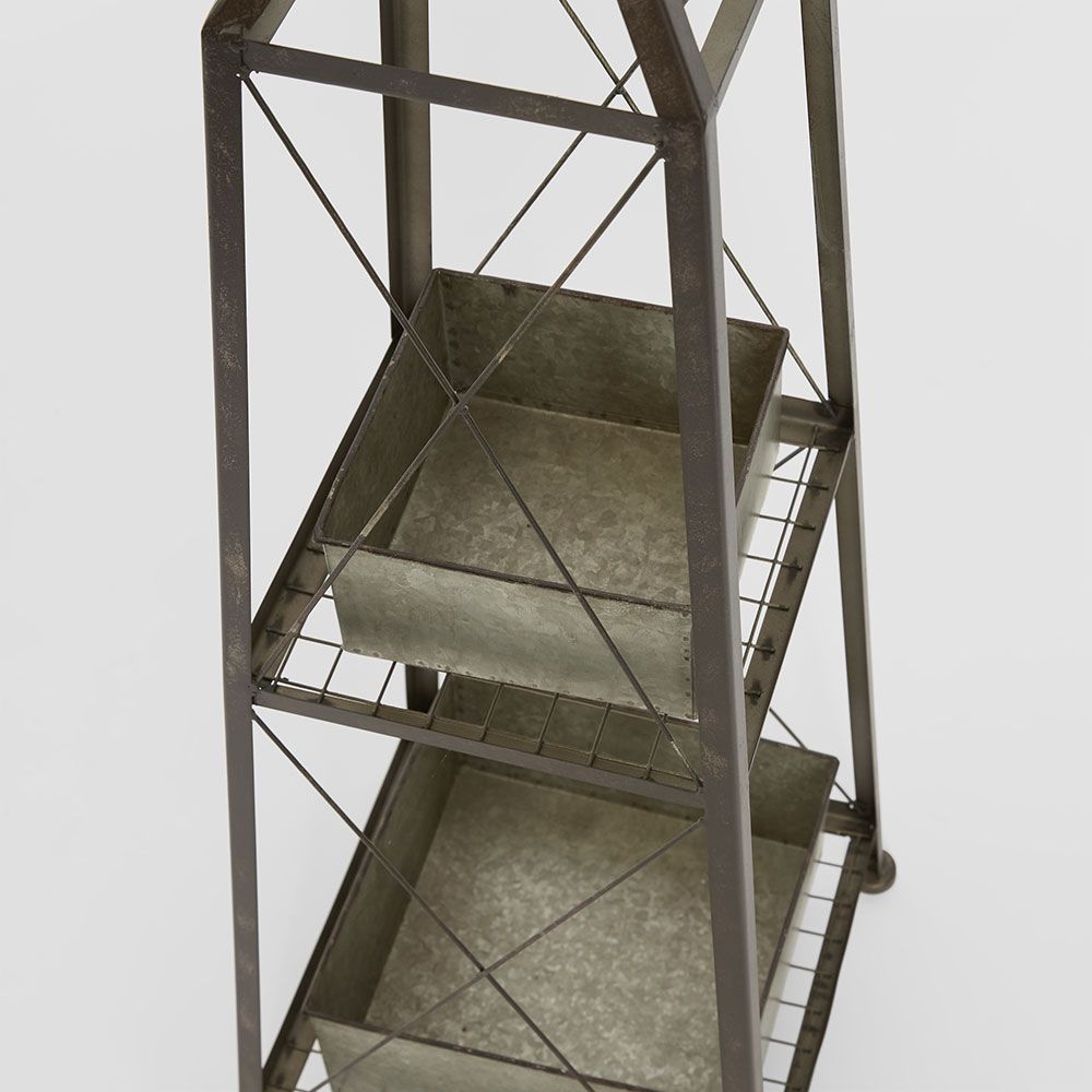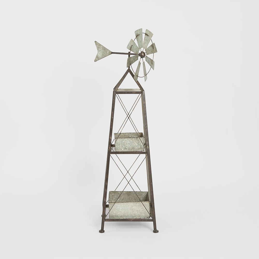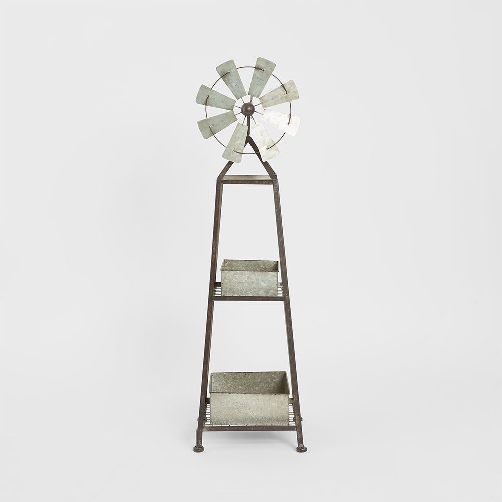 A sleek two-tier shelf designed for functional display of plants, décor, or garden accents. Topped with a wind spinner, it adds a subtle, dynamic feature that brings movement and visual interest to any space. Clean regularly with a soft cloth using warm water and mild detergent to remove any built-up dirt. Avoid using steel wool or metal brushes, as they can leave behind particles that may cause rust.