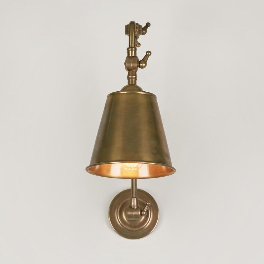 Refine lighting in your home or office space with this polished antique silver/brass finish joint arm solid brass wall lamp. Cromwell is classic adjustable swing arm wall sconce, merge style and functionality for the perfect task lighting solution. With a cone-shaped shade and jointed adjustable arm with three position interlocking feature. Cromwell will add subtle retro touch to your home or business. ADDITIONAL FEATURES * The lamp holder takes A60 LED filament clear glass 6W E27 * Standard Australian domestic fitting * It is wall mounted in a fixed position but the lamp shade can be rotated * The sconce can only be installed indoor Projection (fully extended): 80cm Shade width: 16cm Backplate diameter: 12cm