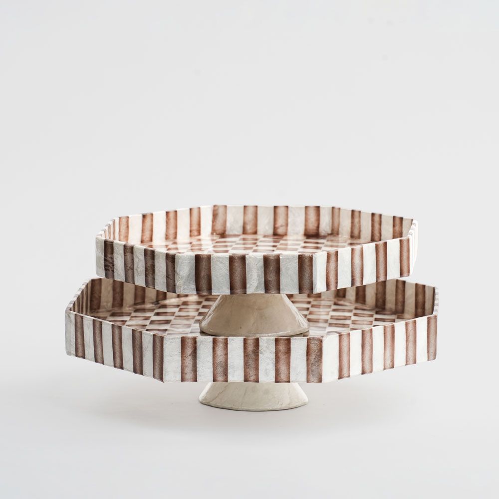 Brown Check Capiz Cake Stand Lge