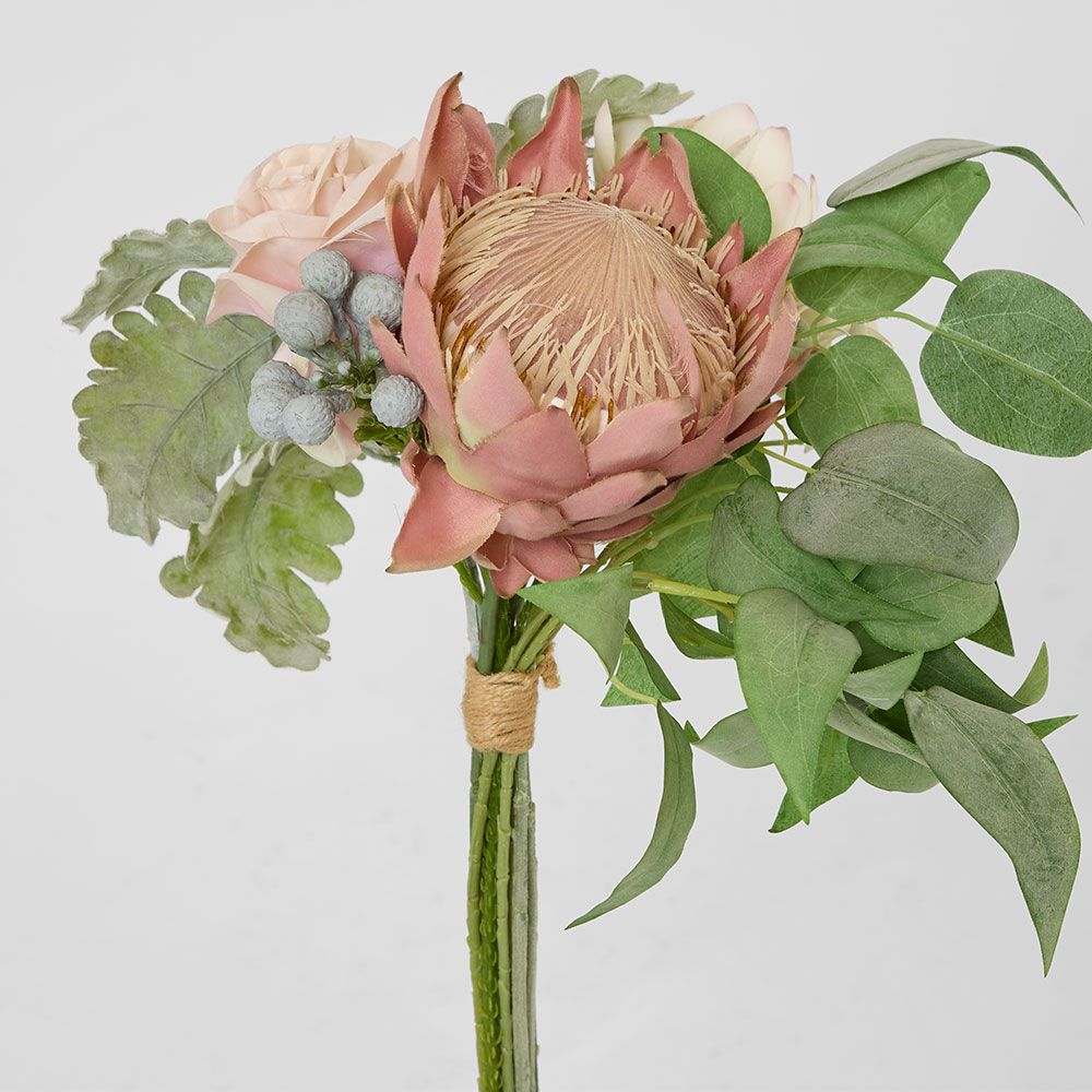 Infuse your space with the timeless elegance of our Protea Rose Dusty Miller Mix Bouquet. A medley of artificial flowers featuring pink Protea and delicate light pink roses harmoniously contrasts with lush green leaves and berries, forming a sophisticated ensemble. Whether in your home, office, or as a centerpiece for weddings and events, this bouquet serves as the perfect final touch, effortlessly enhancing any location it graces.