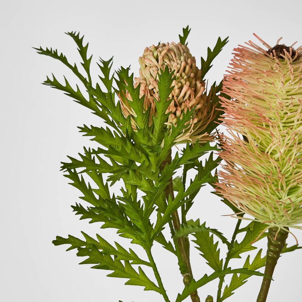 Bring a slice of the Aussie wilderness into your home with our faux Banksia Spray With Bud and Leaf in Pink. Crafted with advanced technology, this lifelike spray features a tall stem adorned with vibrant green leaves and a textured seed pod at the top. Perfect for adding a touch of native charm to any floral arrangement or decorative display, this hypoallergenic and low-maintenance spray brings the beauty of the bush indoors. With no assembly required and just a gentle dusting with a static feather, enjoying the everlasting beauty of Banksia has never been easier or more cost-effective.