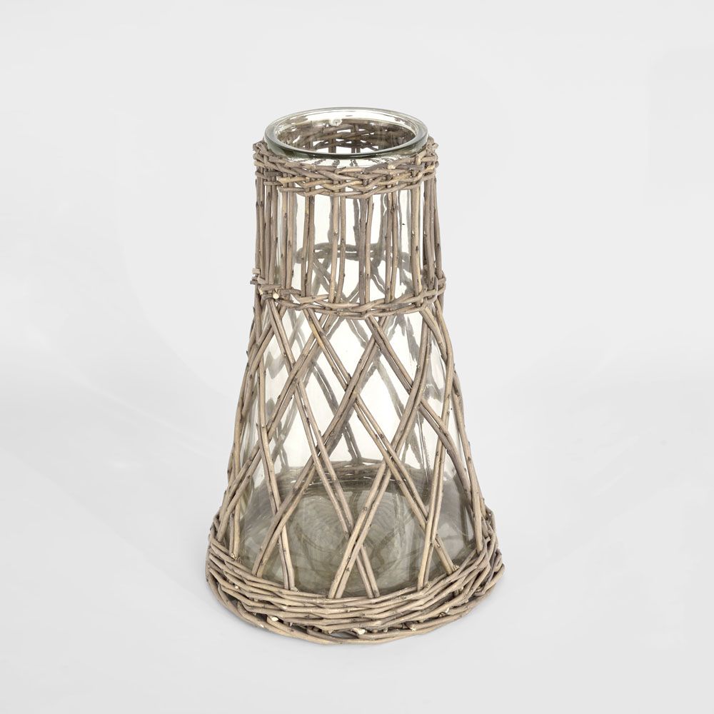This large statement vase features a clear glass vessel encased in a hand-woven willow frame. The tall silhouette and open lattice detailing create visual height and texture, making it ideal for floor styling, entryways, or large arrangements with dried or faux stems. A striking decorative piece that brings natural warmth to any interior.