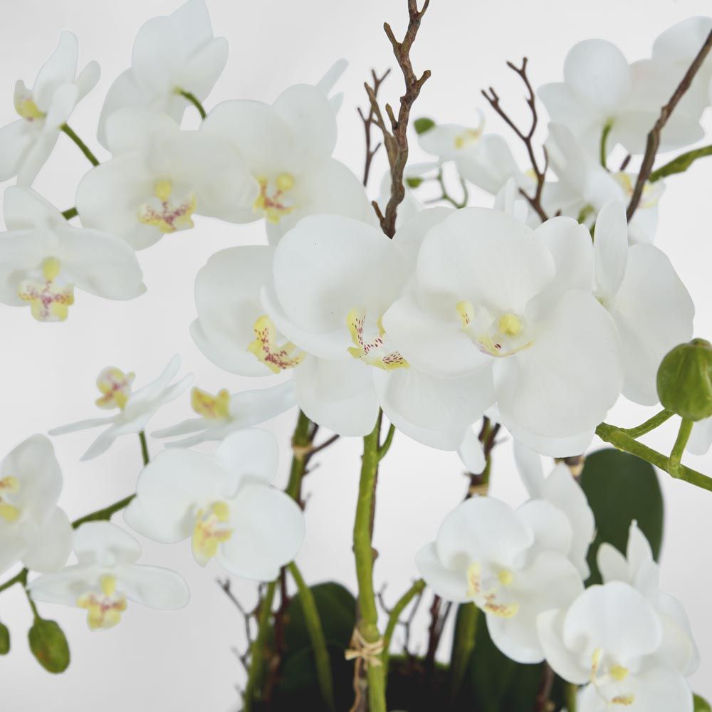 Dive into eternal springtime with our faux Orchid in White Pot with Silver Rim. With delicate white blooms and verdant buds swaying gracefully atop slender stems, this floral masterpiece adds a perpetual touch of elegance to your space. Nestled within a lavish silver pot, complete with exposed roots, glossy leaves, and vibrant moss, it's a tantalizing illusion of Mother Nature's splendor, minus the upkeep.