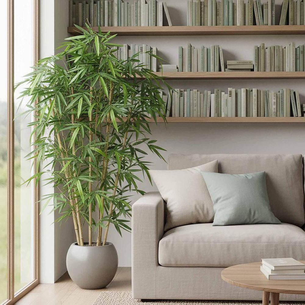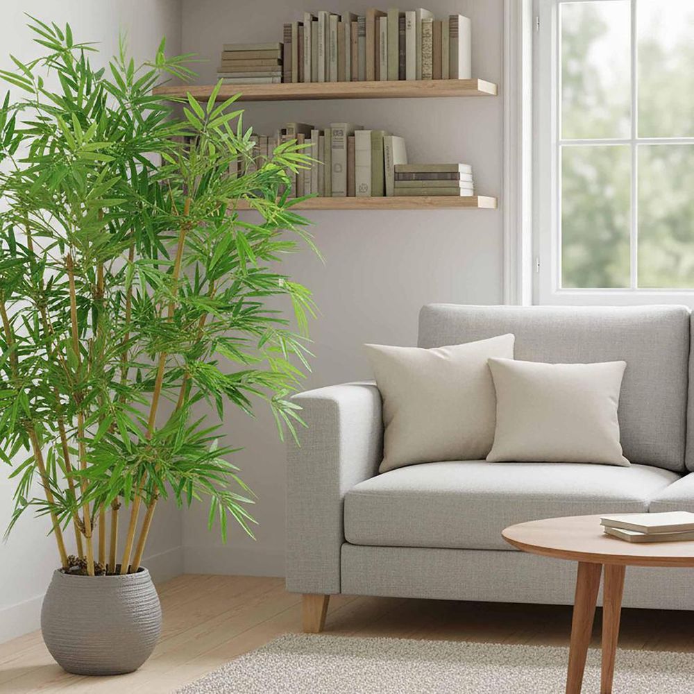Welcome to the jungle, where our artificial Potted Bamboo Tree reigns supreme as the greenery guru of your indoor oasis. With its vibrant green fronds and lifelike trunks, this botanical superstar brings a touch of tropical paradise to any space. Boost your mood and motivation with its biophilic design, while enjoying the convenience of low maintenance - no watering or pruning necessary. And fear not, allergy sufferers, it's hypoallergenic for worry-free enjoyment. Say goodbye to dull spaces and hello to your new green companion, no green thumb required. Disclaimer: To assist you in selecting the right planter size, the diameter of the tree pot ranges from 15-30 cm. Please ensure your chosen pot, planter, or urn has a larger diameter. Additionally, please note that the height of the trees may vary depending on the tree leaves. If you need more precise guidance, feel free to contact us, and we’ll be happy to provide you with exact measurements and assist you further