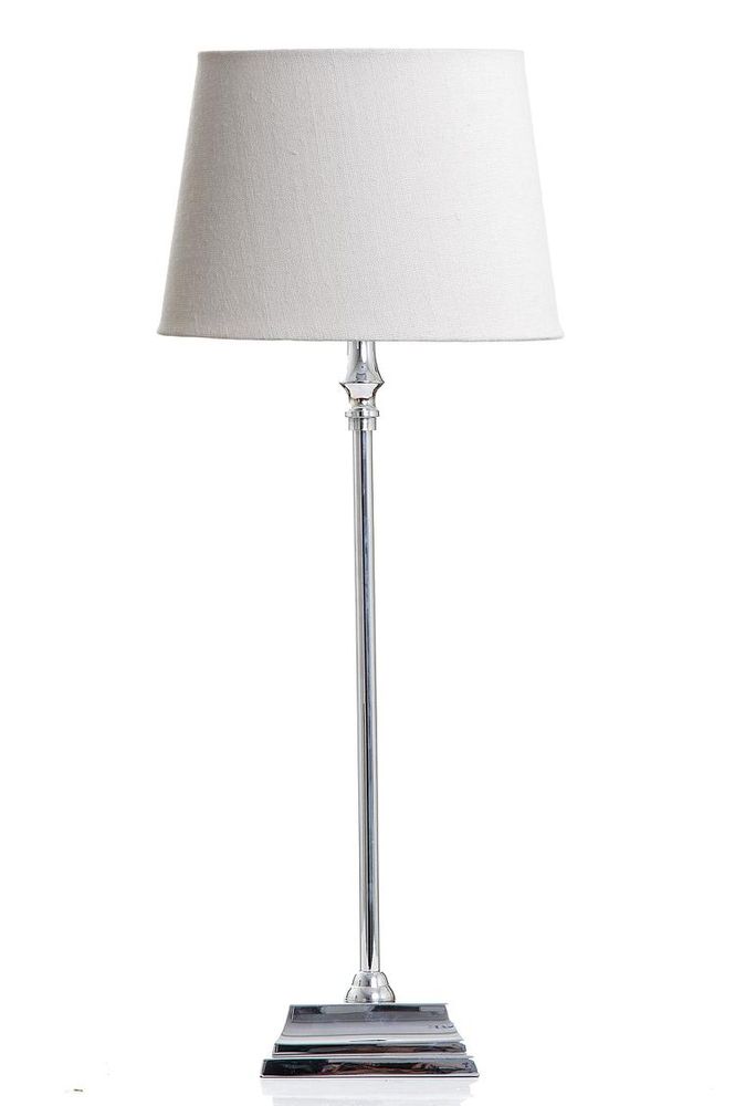 Collins Table Lamp in Shiny Nickel. Fabric shade sold seperately Recommended Shade: SMALL DRUM LAMP SHADE (12X10.5X8 H) - TEXTURED IVORY - LINEN LAMP SHADE WITH E27 FIXTURE Recommended globe:A60 LED FILAMENT - CLEAR GLASS - 6W B22 2200K